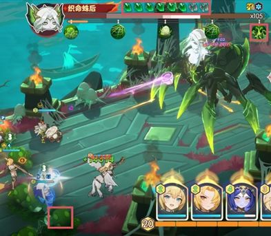如上图,玩家在战斗中需要观察绿色能量点和黄色技能进度条并且记住织命蛛后技能图标。能量点还是绿色的时候,玩家每净化一个【蛛卵】可减少蛛后1.5%生命,并减少一点能量。【蛛卵】会出现在某个幻灵附近,玩家需要及时使用祝福类技能释放到该幻灵身上,同时可净化【蛛卵】。这也是玩家的主要伤害来源,织命蛛后的技能都有概率创建一定数量【蛛卵】并回复等同于【蛛卵】数量的能量点,能量点会强化织命蛛后技能伤害。