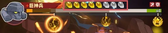如上图,玩家在战斗中需要观察能量点(黄、蓝、红)和黄色技能进度条并且记住巨神兵技能图标。巨神兵有雷、冰、火三种形态并且当处于这三种形态时自带【感电】、【寒冷】、【灼烧】,需要触发相应的【元素反应】才能减少1.6%生命并减少一点能量点(共八点),这也是玩家的主要伤害来源。巨神兵技能条进度满之后会切换形态,也可以通过触发【元素反应】消耗完当前形态的能量点使其短暂瘫痪并提前切换形态,这也是可以避免巨神兵释放高额伤害范围技能的方法。