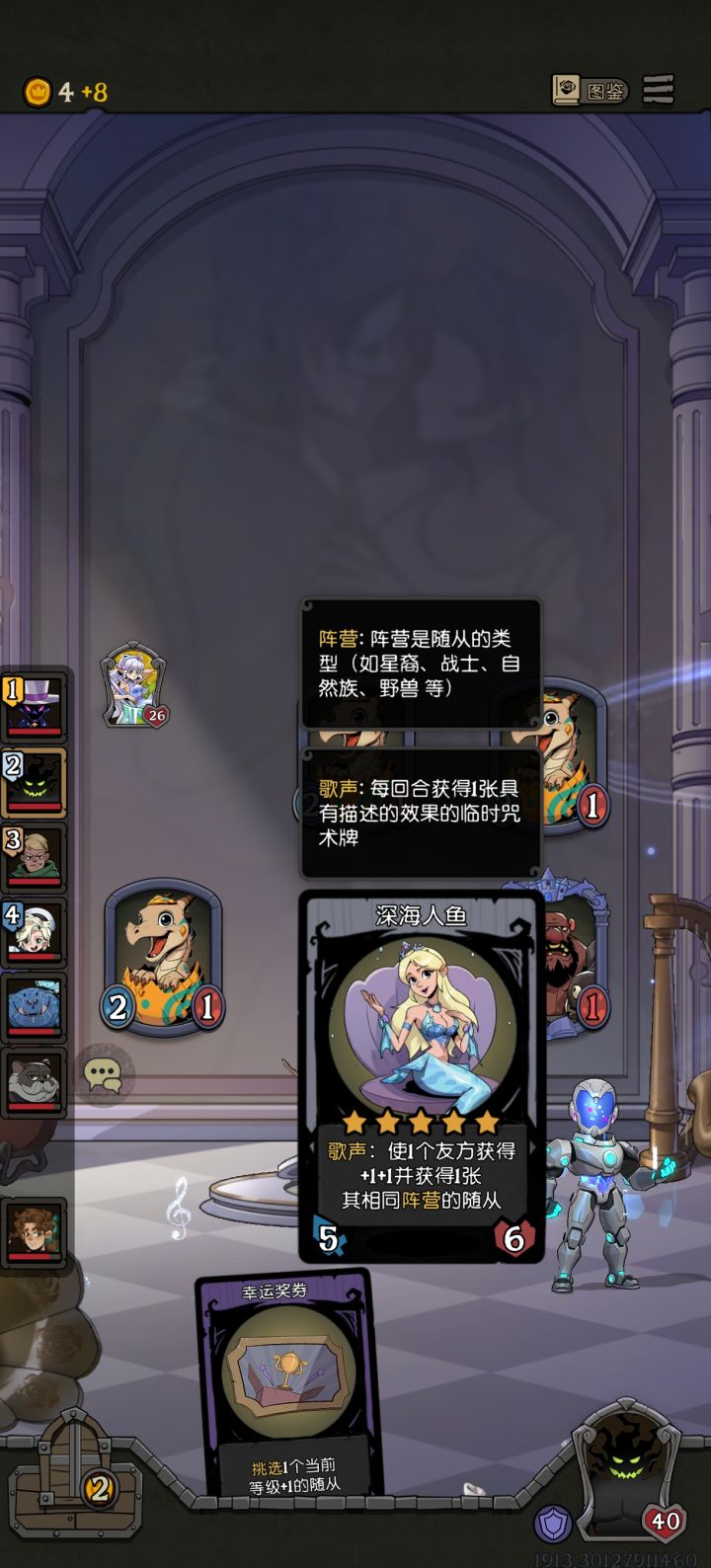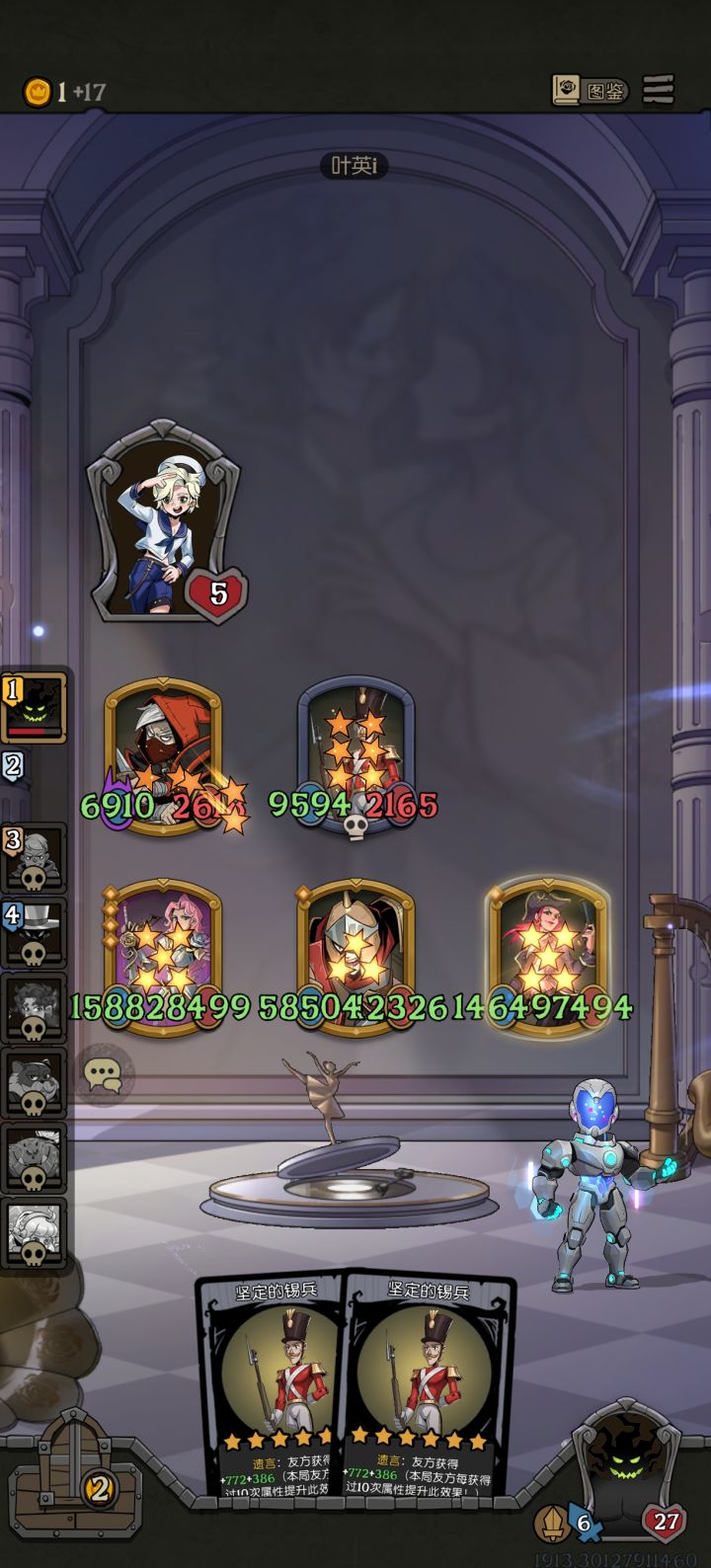 从对面美人鱼没防我开始就感觉这把稳了,后面一人上供一个锡兵助我大成,要不是中间贪歌声说不定还能满血过关,不过看到+1600/+800感觉贪的挺值的,不过对面也挺强的,很早就拿到了金玫瑰剑士,后面还有双重生+双饼干+金小丑,就是锡兵数值太低了,翻7倍都补不上差距,场上原阵容也小,不够我刺客砍的,没办法用嘲讽防对策。战士局还是以刷数值和防对策为第一要务