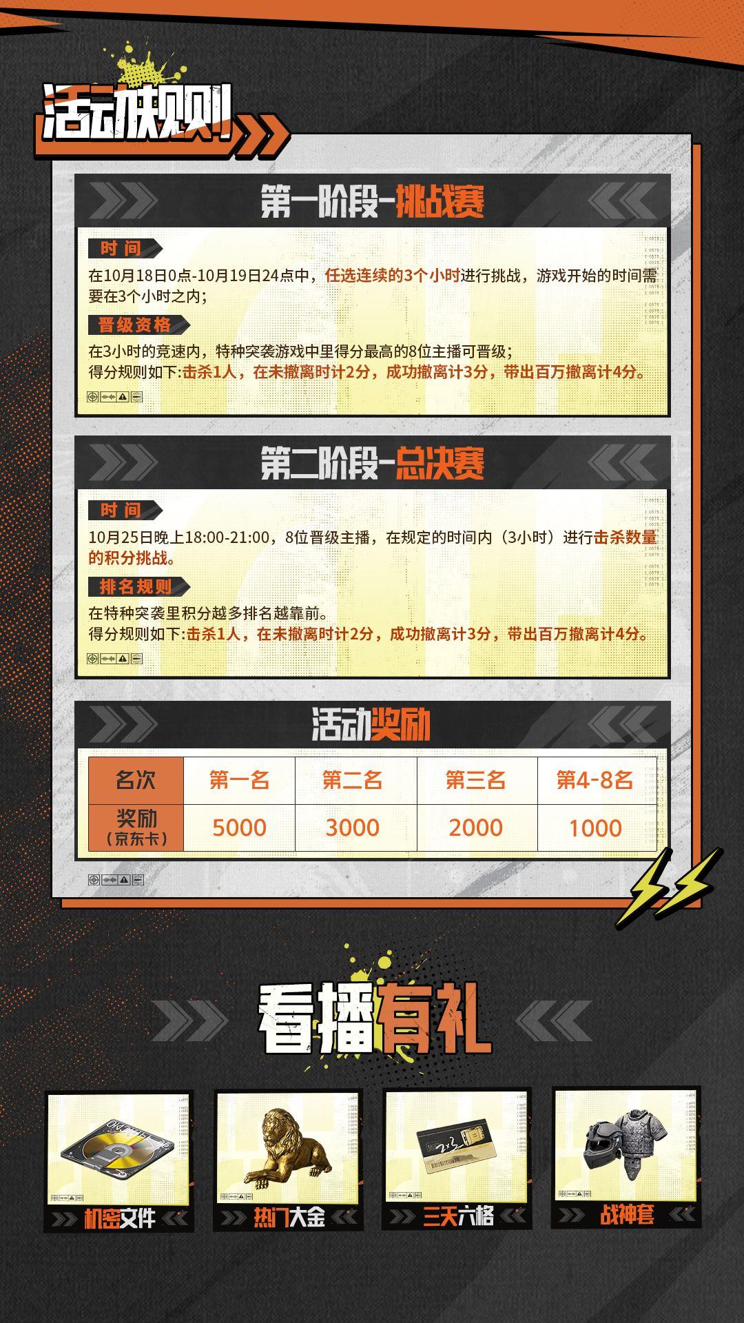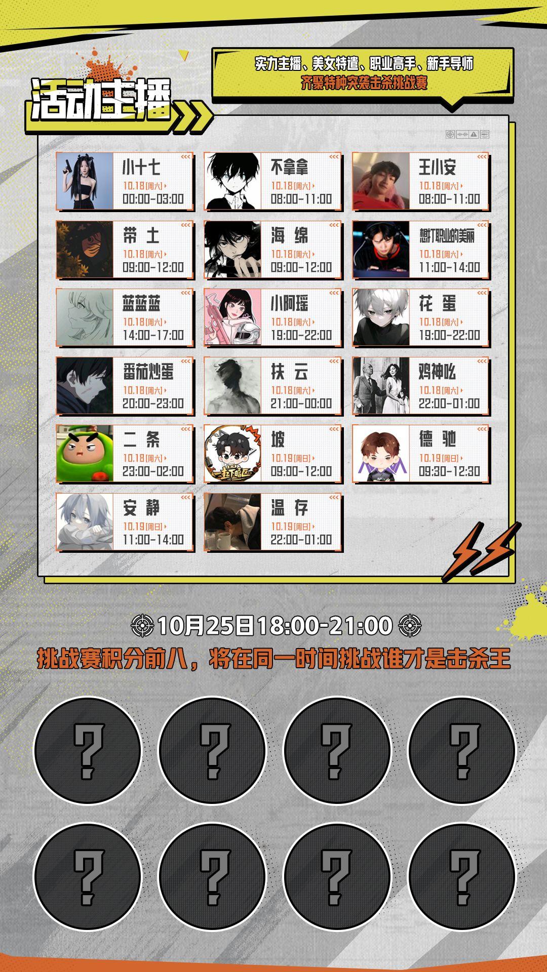 17位主播在10月18-19日进行击杀挑战,快节奏接敌,教你如何快速赚钱上分,3小时内击杀可获得积分,成功撤离、百万撤离均可使本局积分翻倍!积分前8即可进入10月25日晚18点的决赛,挑战瓜分万元奖励!谁才是特种突袭的主宰?让我们拭目以待!