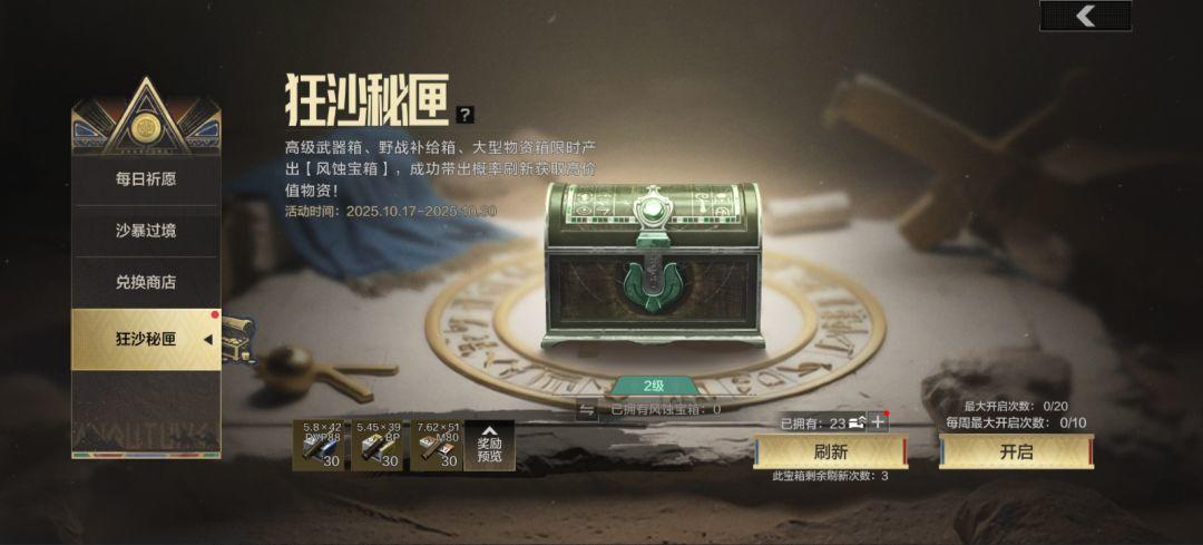 活动规则点击【活动】-【砂蚀之境】-【狂沙秘匣】即可进入宝箱开启页面。砂蚀之境的神秘宝藏现身卡莫纳,只需在对局内搜索高级武器箱、野战补给箱、大型物资箱,就有概率在容器中找到【风蚀宝箱】!如果在对局中看到这些容器记得多留意一下哦!