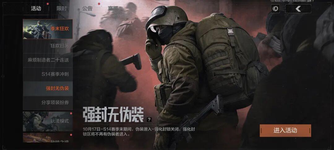 10月17日至S14赛季末,伪装潜入-强化封锁限时关闭,强化封锁不再有伪装者进入!