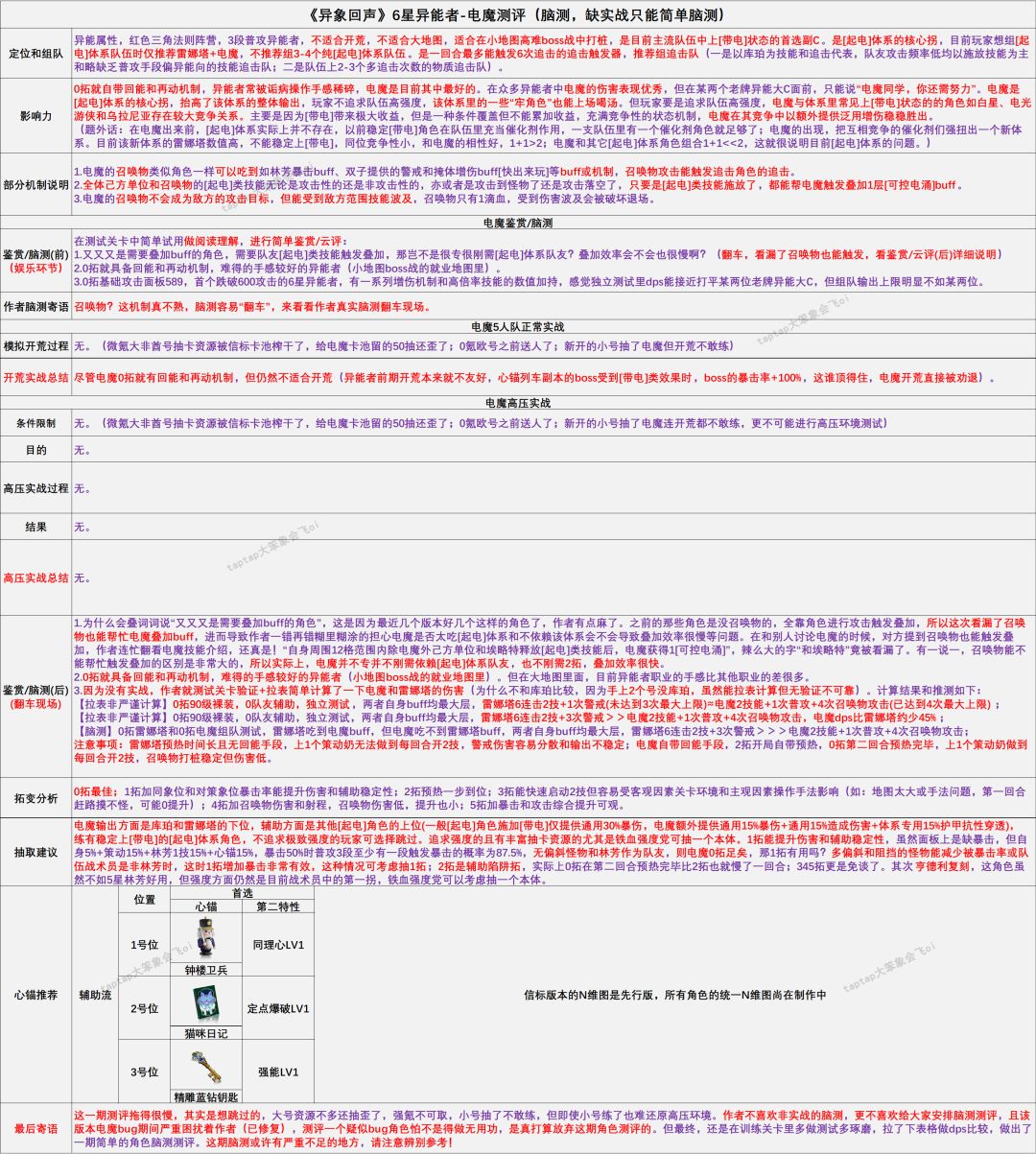 这一期测评拖得很慢,其实是想跳过的,大号资源不多还抽歪了,强氪不可取,小号抽了不敢练,但即使小号练了也难还原高压环境。作者不喜欢非实战的脑测,更不喜欢给大家安排脑测测评,且该版本的电魔bug期间严重困扰着作者(已修复),测评一个疑似bug角色怕不是做无用功,是真打算放弃这期角色测评的。但最终,还是在训练关卡里多做测试多琢磨,拉了下表格做dps比较,做出了一期简单的角色脑测测评,脑测或许有严重不足的地方,请注意辨别参考!#异象回声 #异象回声电魔测评
