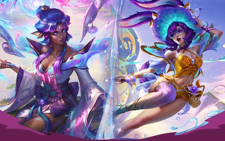 卡尔玛为一名我方英雄提供一个蓝粉色渐变护盾,并提高其移动速度,护盾上双鱼环绕急剧游动,莲瓣悠悠飘舞其中。