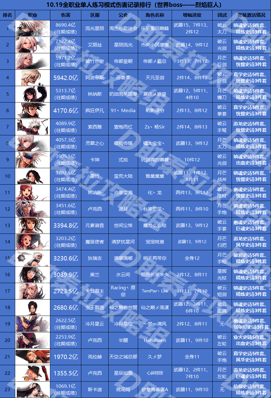 注:现因单人练习排行榜有高伤害限制,单人超过3500亿的成绩有较大的概率不会在游戏排行榜显示,所以可能会丢失一些职业记录,欢迎大家将一些高伤害记录投稿,笔者都会积极采纳的,另外装备打造为排行榜外显装备,与实际打伤装备可能存在差异