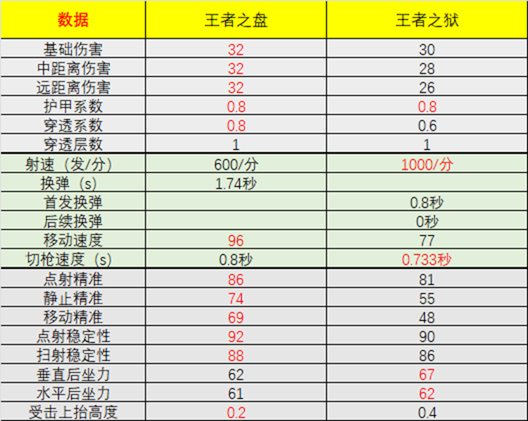 在移动速度上“王者之盘”更加灵活,但其射速与高达1000发/分的“王者之狱”差距非常的大,只有600的射速。但在其精准度上全面领先,且穿透增加到了0.8,配合无距衰的32基础伤害,穿透箱子命中防弹衣也能打出20伤害,在掩体多的地图也能一展身手,不仅如此受击上抬高度也加强到了0.2。在这样的数据面板下,这把新登场的王者机枪与其说是机枪,不如说是AK系列增加弹匣容量Plus版本。