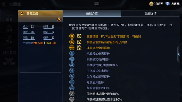 “王者之盘”不但继承了王者武器的馈赠技能,还拥有挑战模式伤害、载弹、得分提升,并且在生化模式中也拥有伤害提升和载弹提升。这几项非常实用的技能,能够在这两个模式中大杀四方。乍一看这款王者武器的技能池只适用于生化与挑战模式,那么这款武器难道不能像“王者之霆”一样活跃在爆破和团队模式中吗?