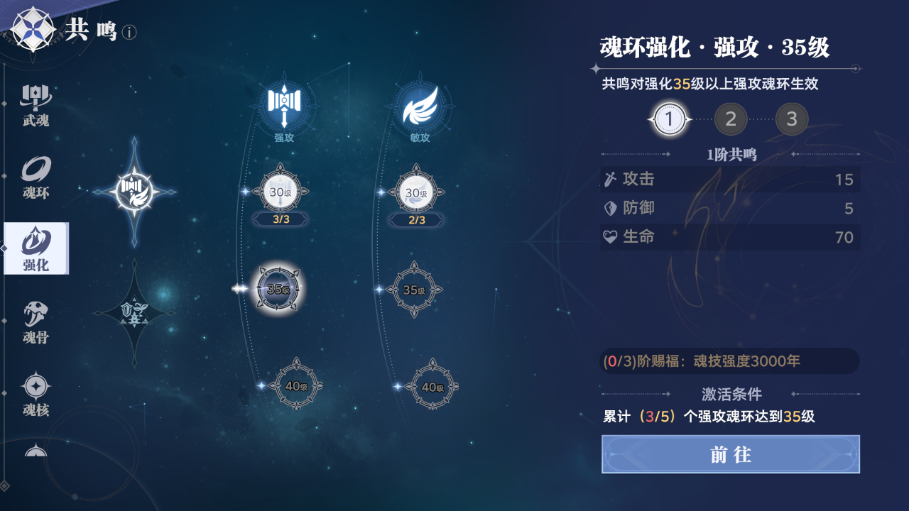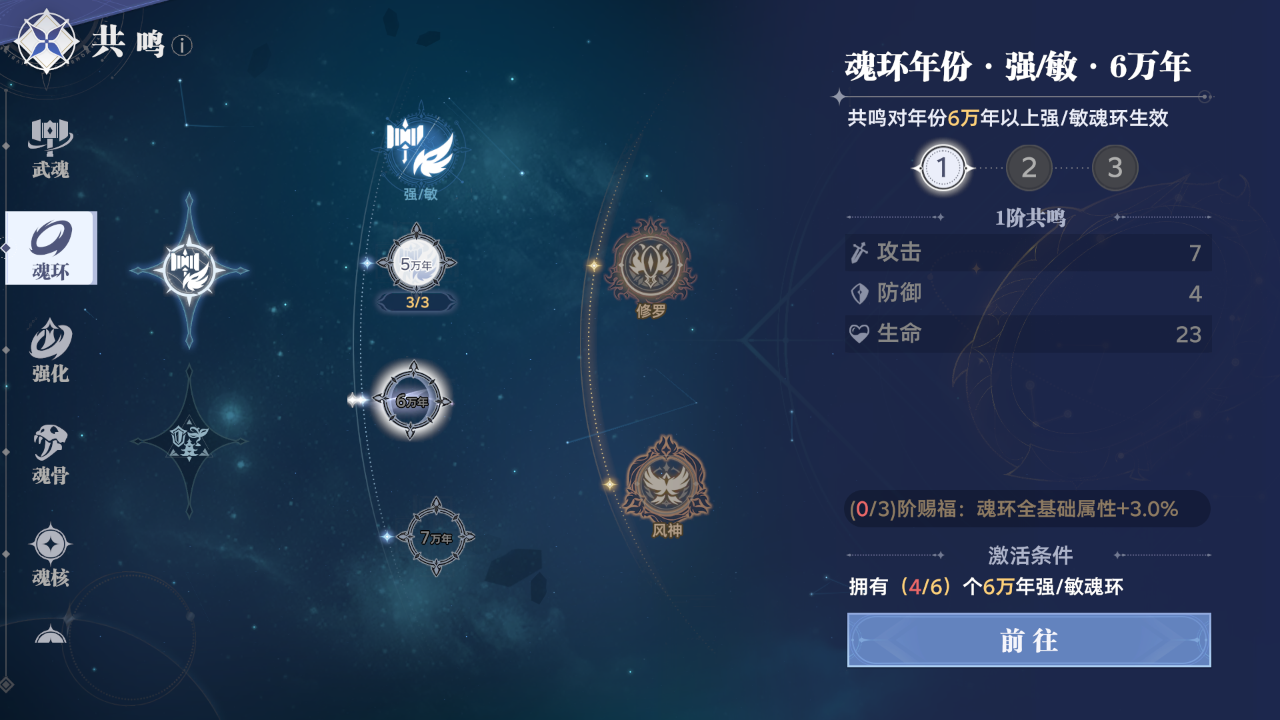 强化共鸣:也是分为强敏攻和辅助控制系两大类,分别对应不同等级的魂环强化的数量来点亮共鸣。