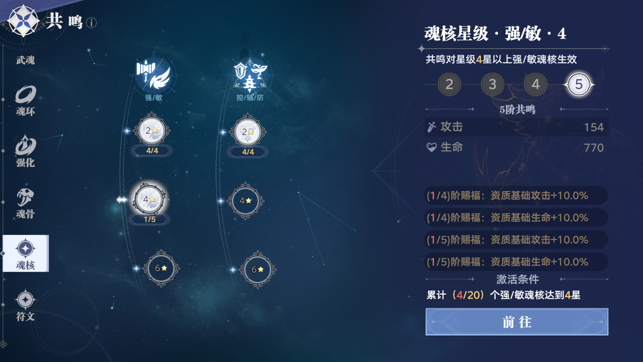 魂核共鸣:必须明确一点:不管强敏攻还是辅助控制两大类的魂核共鸣,前期毕业条件都是惊人的20个4星魂核!(最终是20件6星魂核)这注定是一场持久战。