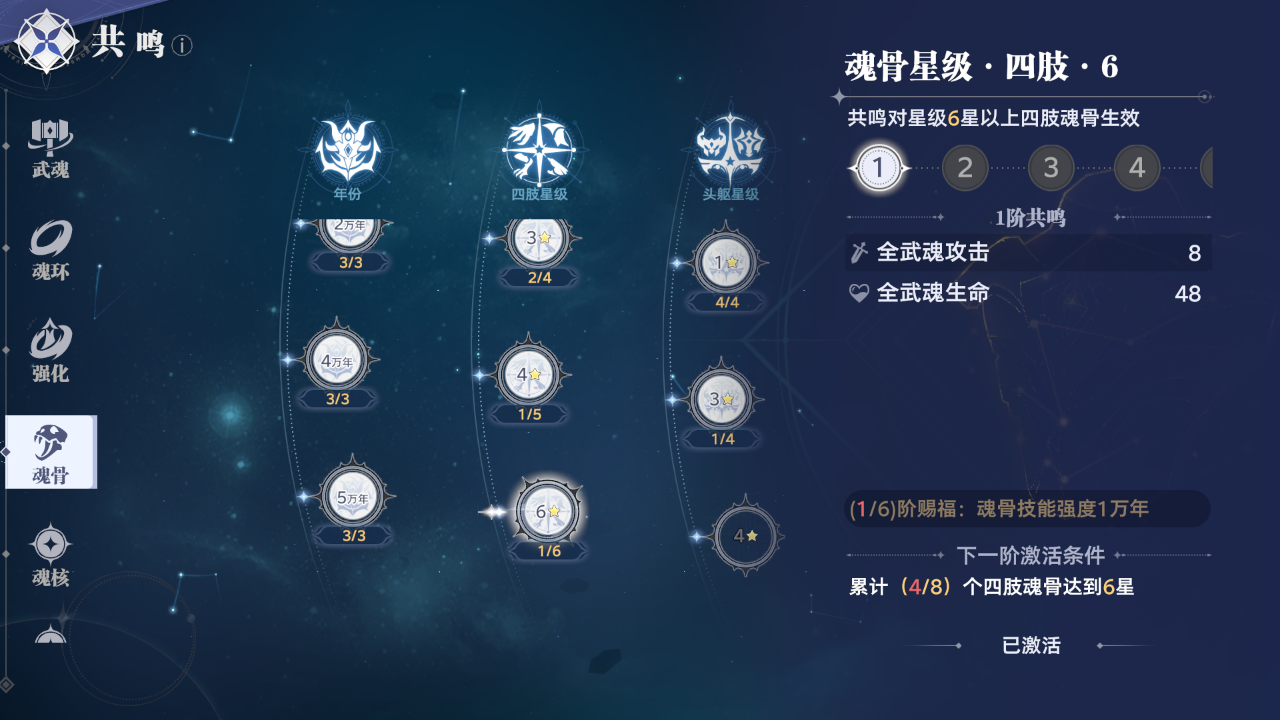 魂骨共鸣:分为年份、四肢星级及头躯星级三个类别分队对应不同的要求点亮共鸣。