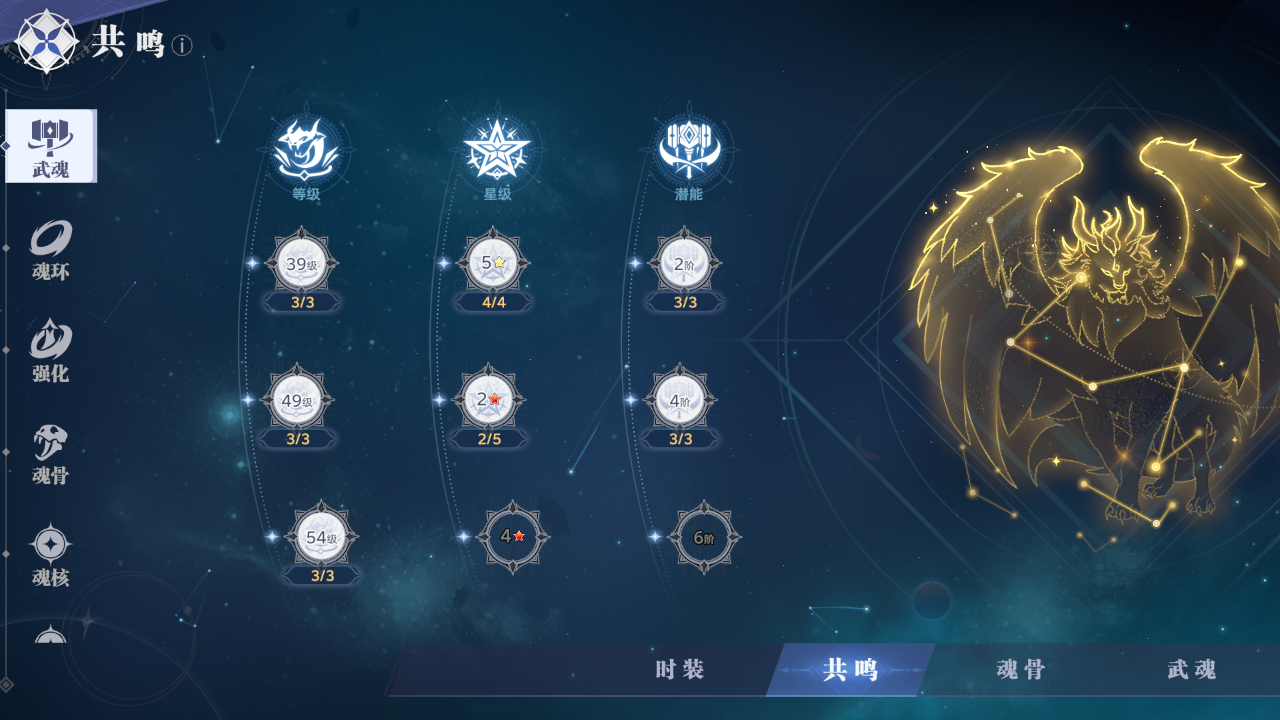 武魂共鸣:分为等级、星级以及潜能,三个类别来进行养成提升,每一个节点下面还分了共鸣等级,满级的共鸣能增加非常高的战力,甚至增加基础属性的成长,是我们万万不能忽略的。