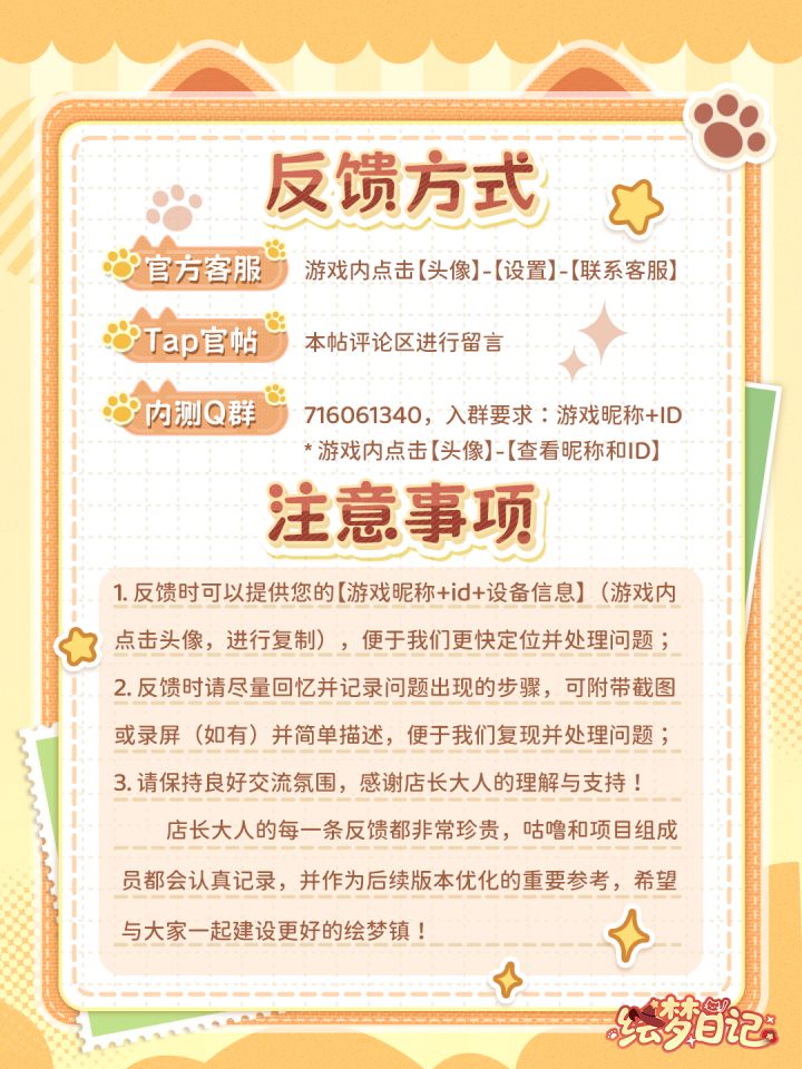 1. 反馈时可以提供您的【游戏昵称+id+设备信息】(游戏内点击头像,进行复制),便于我们更快定位并处理问题;
