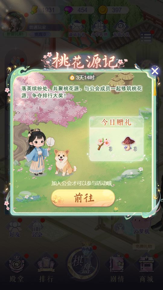 每日积累桃花露为公会桃源增添风光,可获得好礼,内含修筑道具、棋盘道具、体力等。