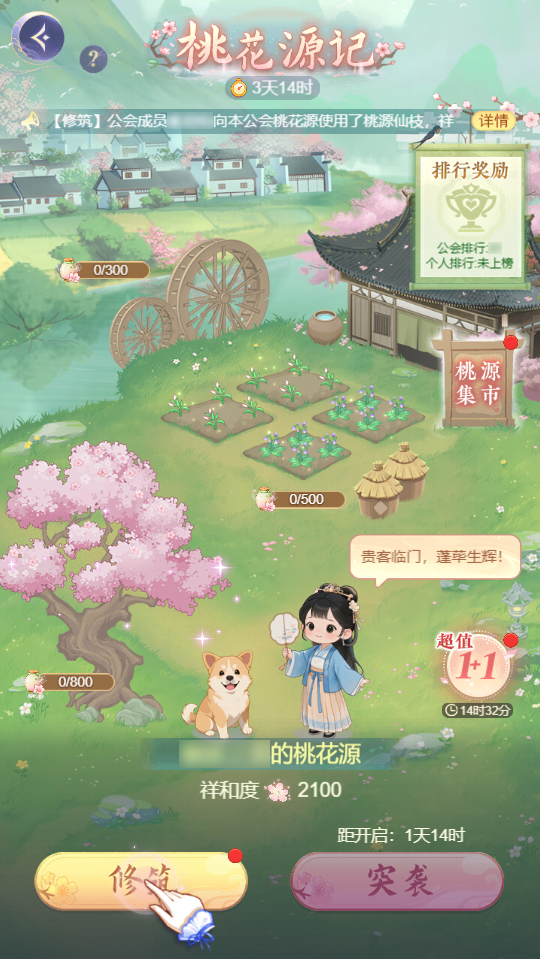 ◈ 活动期间,与公会的家人们一起修筑桃源,提升自家桃源的祥和度,赢取排行大奖吧!通过每日赠礼;超值礼包;桃源集市-商铺;棋盘赏金任务;棋盘购买气泡/商城购买棋子获得桃源仙土兑换,即可获得修筑、突袭道具。