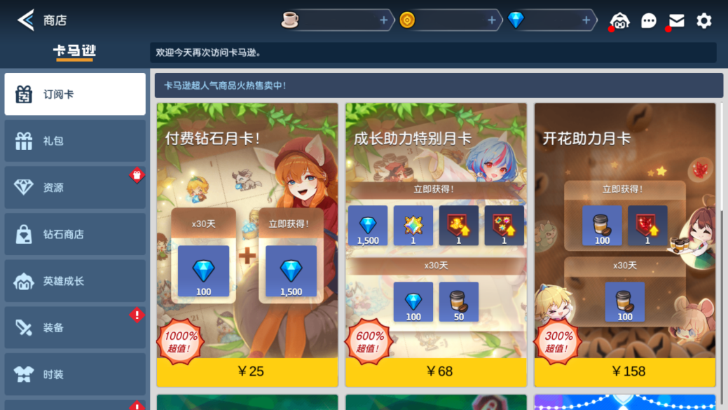 订阅卡页签中包含付费钻石月卡、成长助力特别月卡、开花助力月卡以及限时订阅礼包/签到礼包。