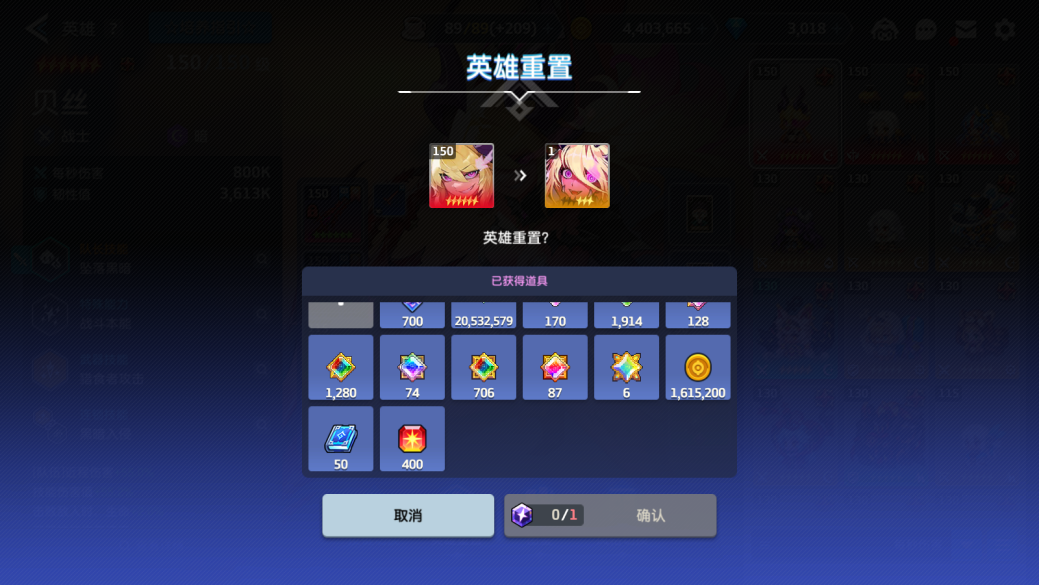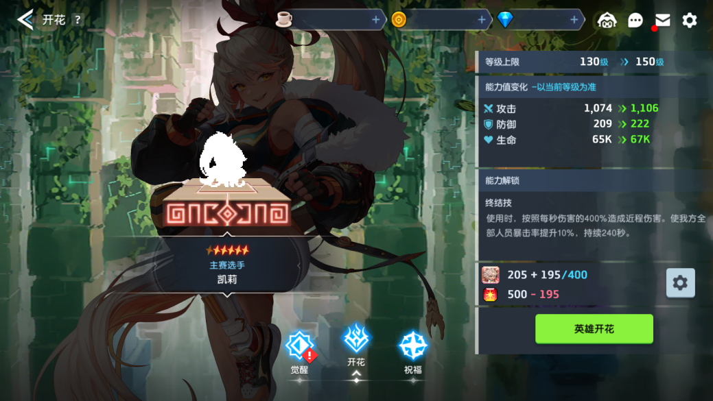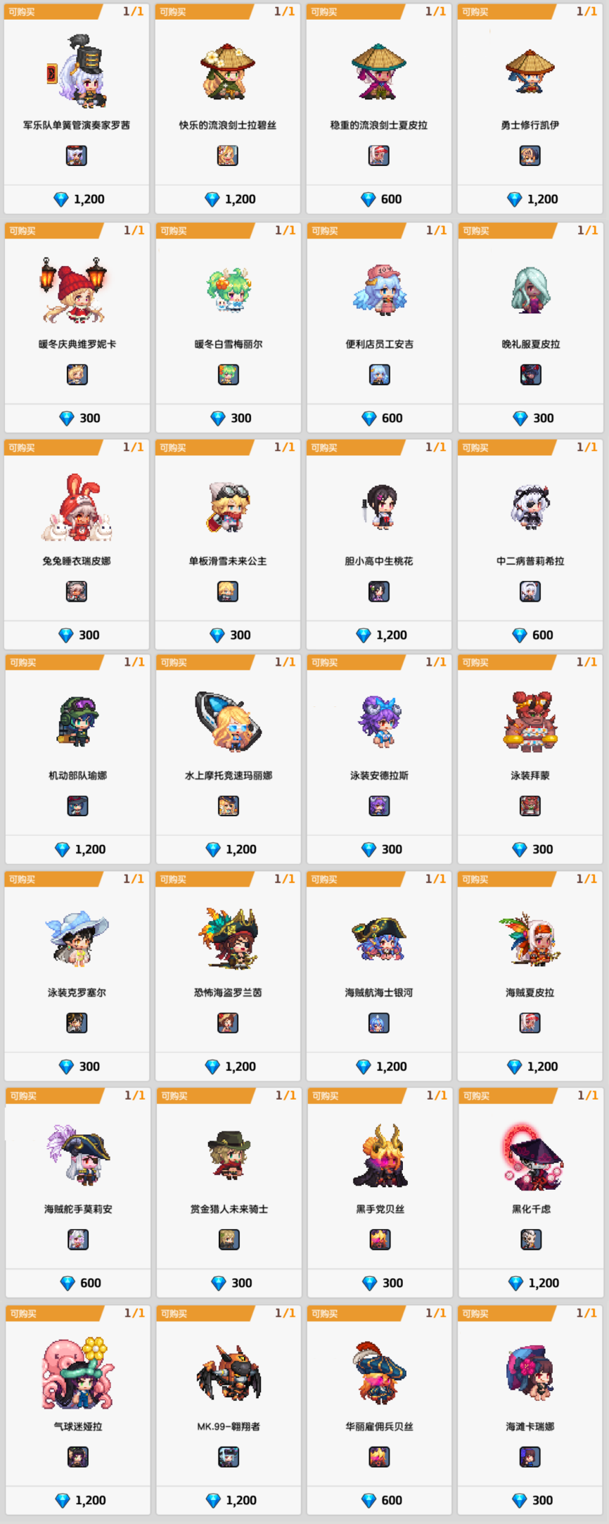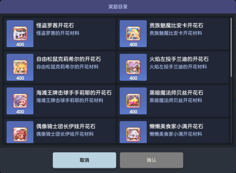 栏位1:英雄开花石*400,截止到怪盗罗茜的已开花英雄(AA72、骑士除外)