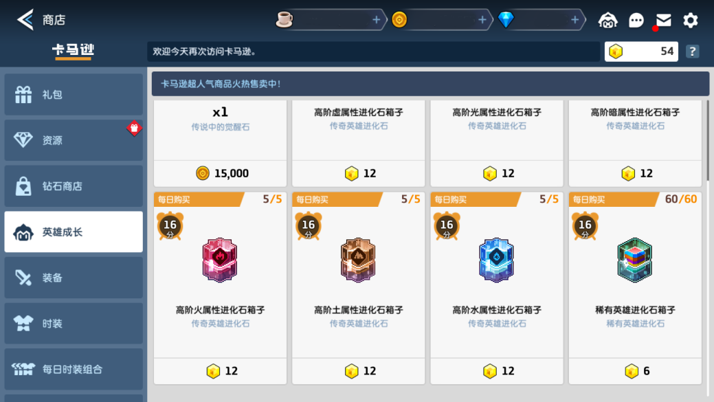 3)【英雄成长】商店中,梦幻进化石兑换英雄进化石商品删除。
