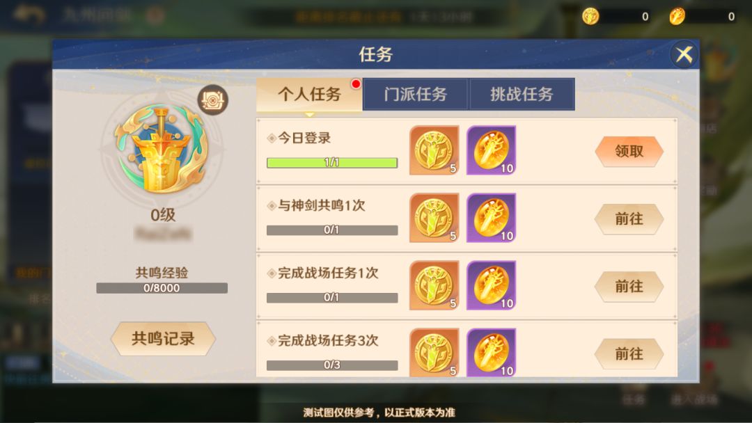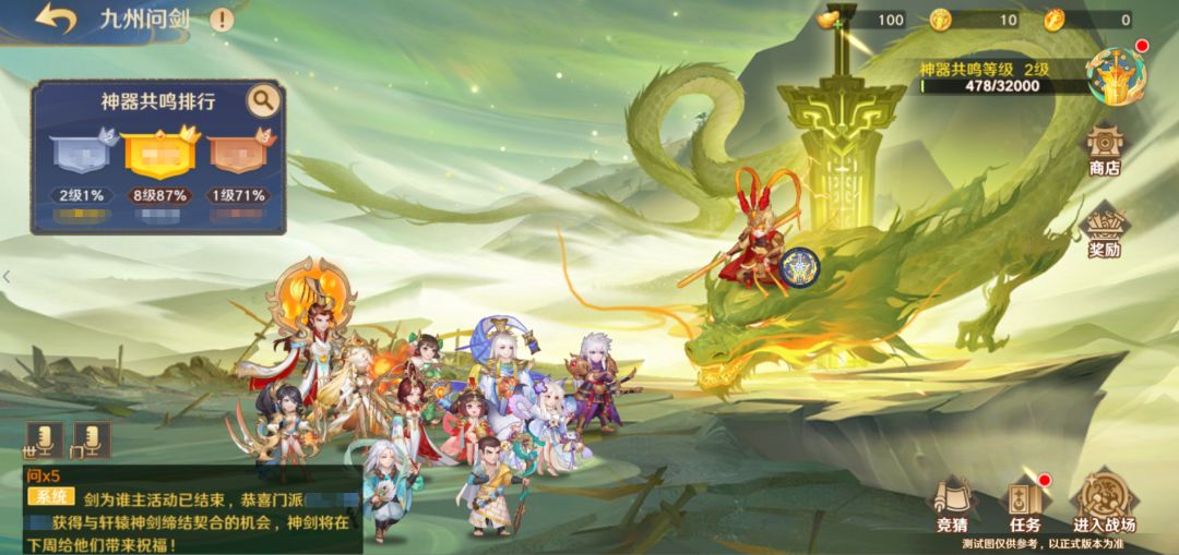 活动时间内,门派共鸣经验不会清除,且每周通过个人任务、门派任务获得的轩辕剑魂,和通过挑战任务获得的共鸣经验会比前一周更多。每周日4:00,日常阶段将进行神器共鸣结算,分组内每个服神器共鸣排行前3的门派,即24支队伍,将获得参与后续“剑为谁主”争夺战的资格。