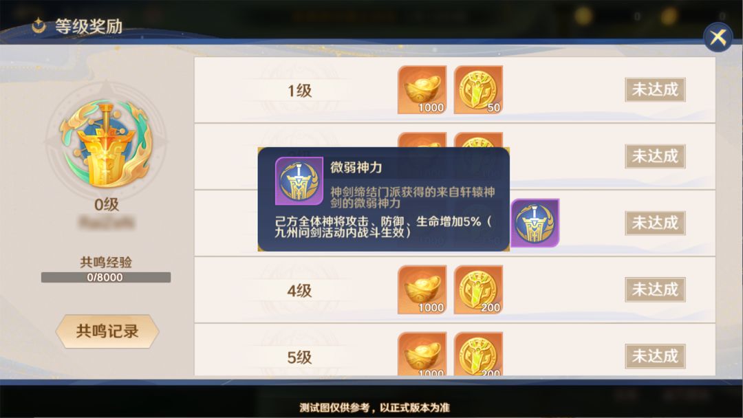 共鸣经验达到一定数值可获得共鸣等级奖励,共鸣等级奖励包括大量元宝、剑之祝福、不同品质的神力。神力能在九州问剑活动内增加守护使的全体神将攻击、防御、生命。