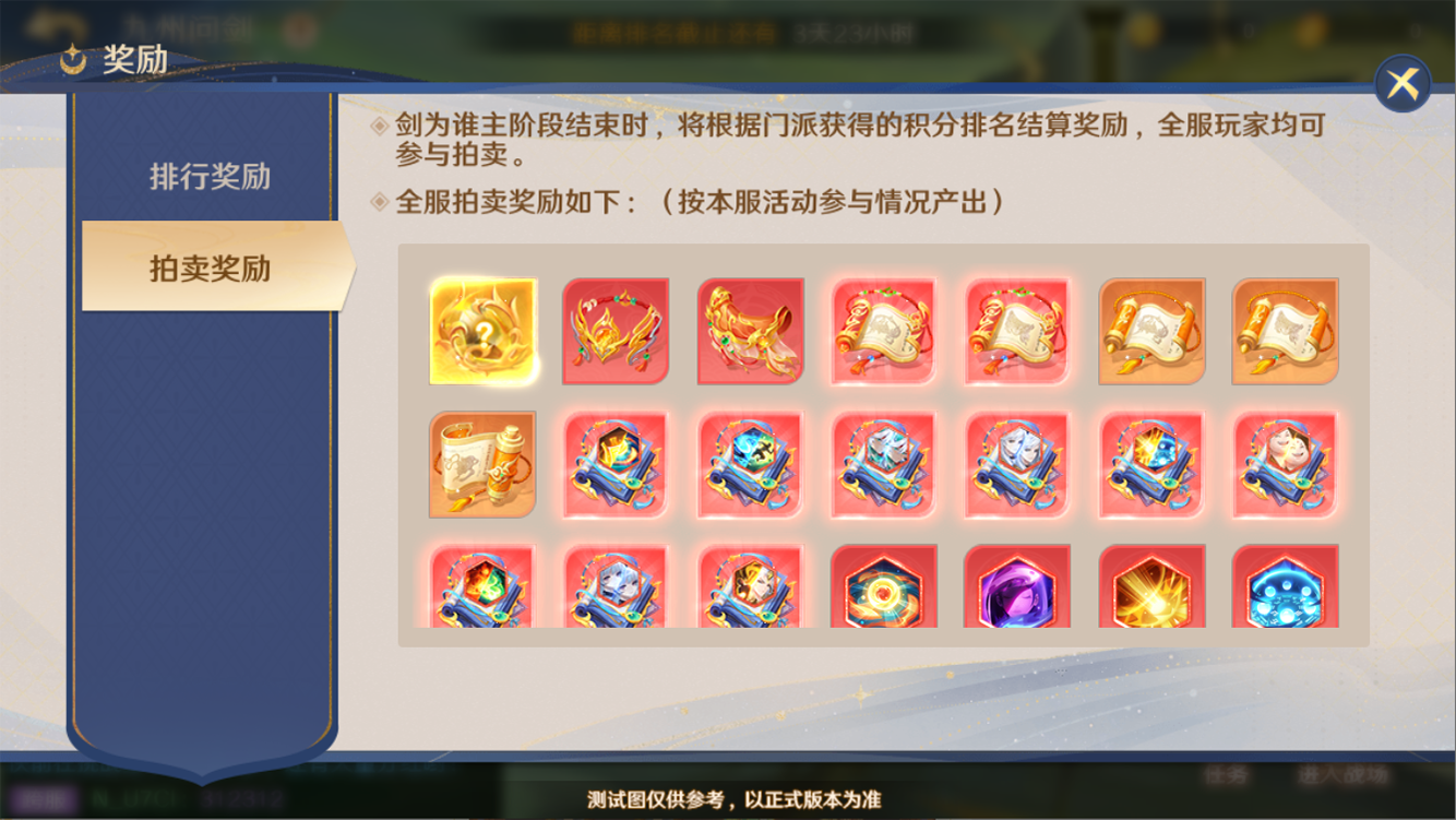 “剑为谁主”阶段结束后,将会根据全服活动参与情况产生全服拍卖奖励,全服玩家均可参与拍卖,拍卖道具包括龙年金将碎片任选、红色灵骑装备、灵骑装备升品道具、各类红色橙色命格、楚辞、诗经、仙露、红·万能法宝等道具。
