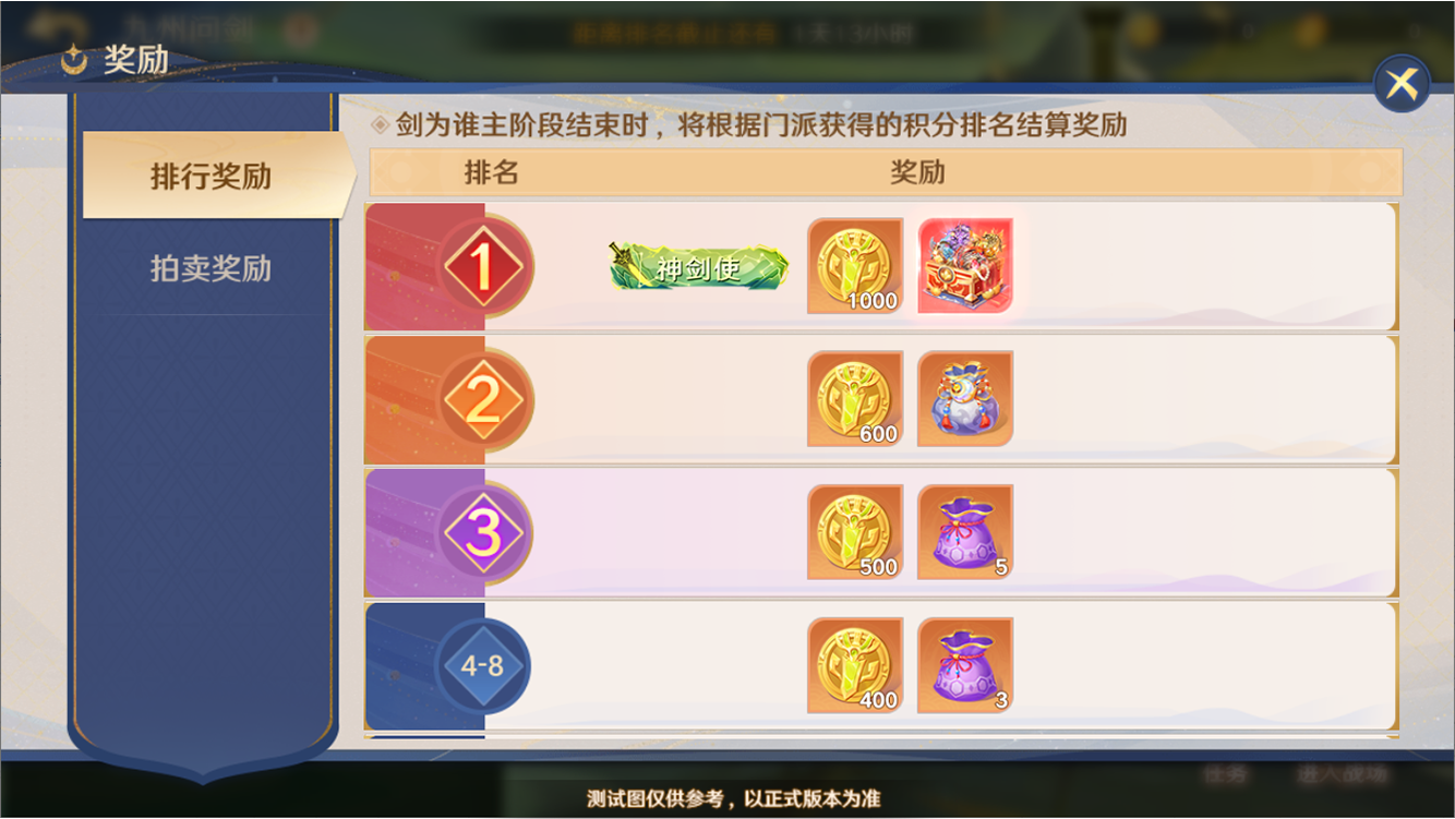“剑为谁主“阶段结束后,将根据门派获得的积分排名结算奖励,并通过邮件自动发放:
