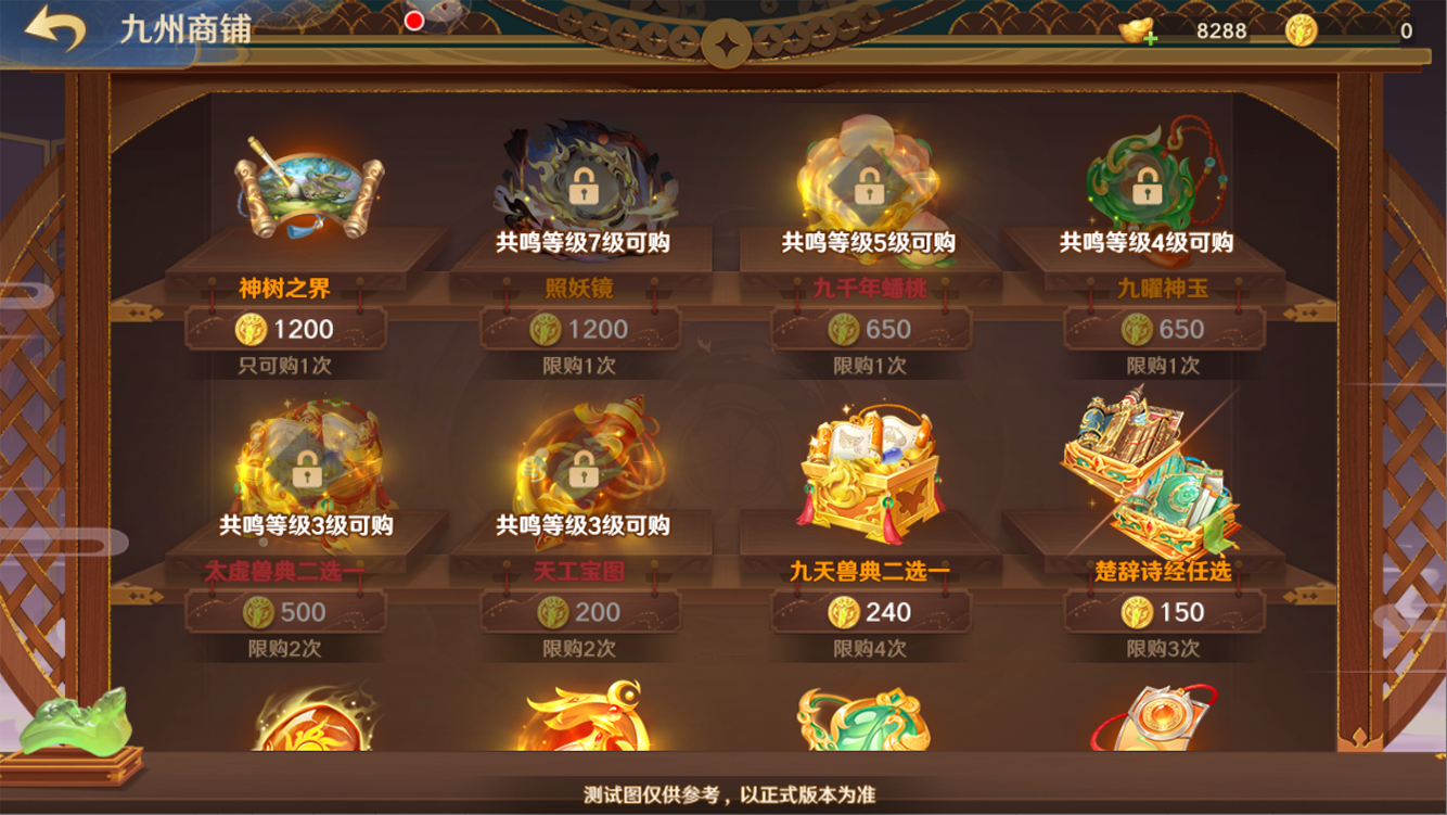 “剑为谁主”结算时,将根据门派排名获得大量剑之祝福。活动中获得的剑之祝福可在九州商铺中兑换主城背景·神树之界、九天兽典二选一、楚辞诗经任选、仙露、灵霄星召券等道具奖励。提升门派共鸣等级还可解锁橙色品质仙藏-照妖镜、九千年蟠桃、灵骑装备九曜神玉等道具进行兑换。