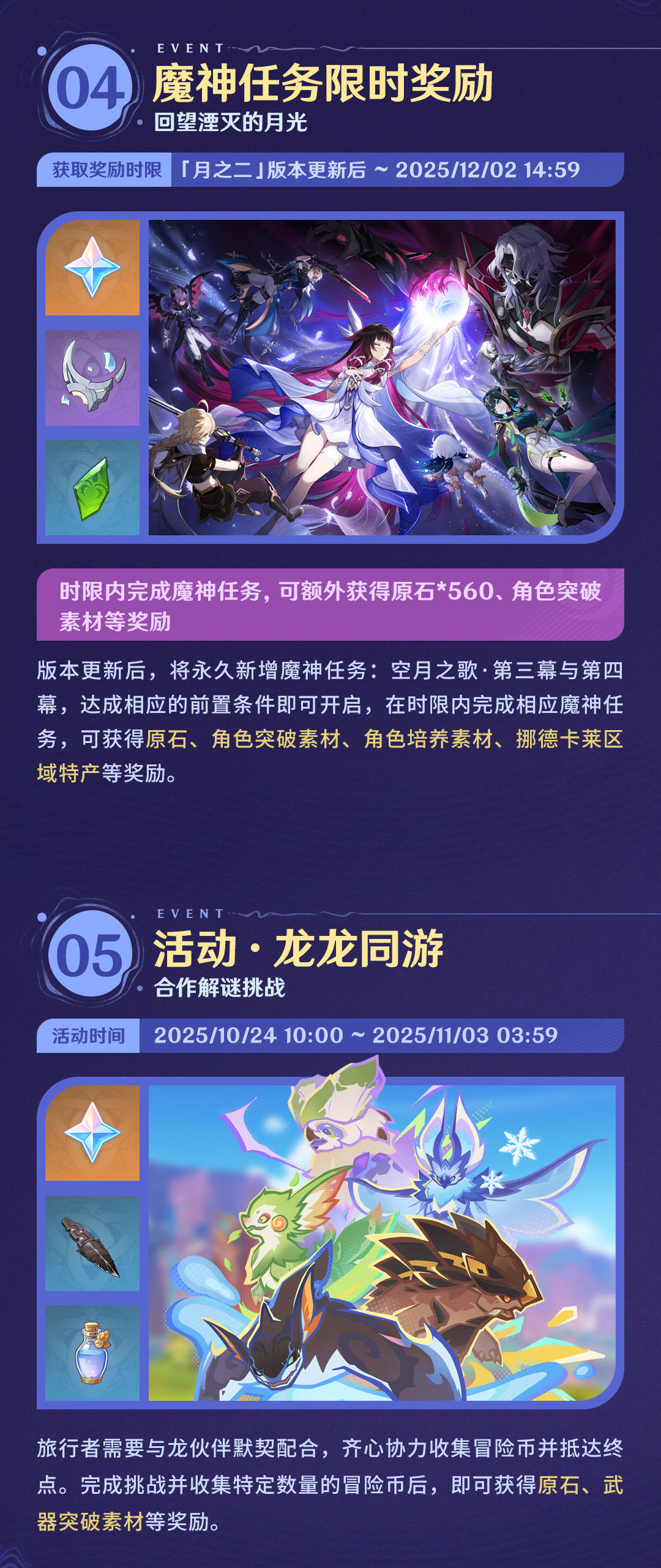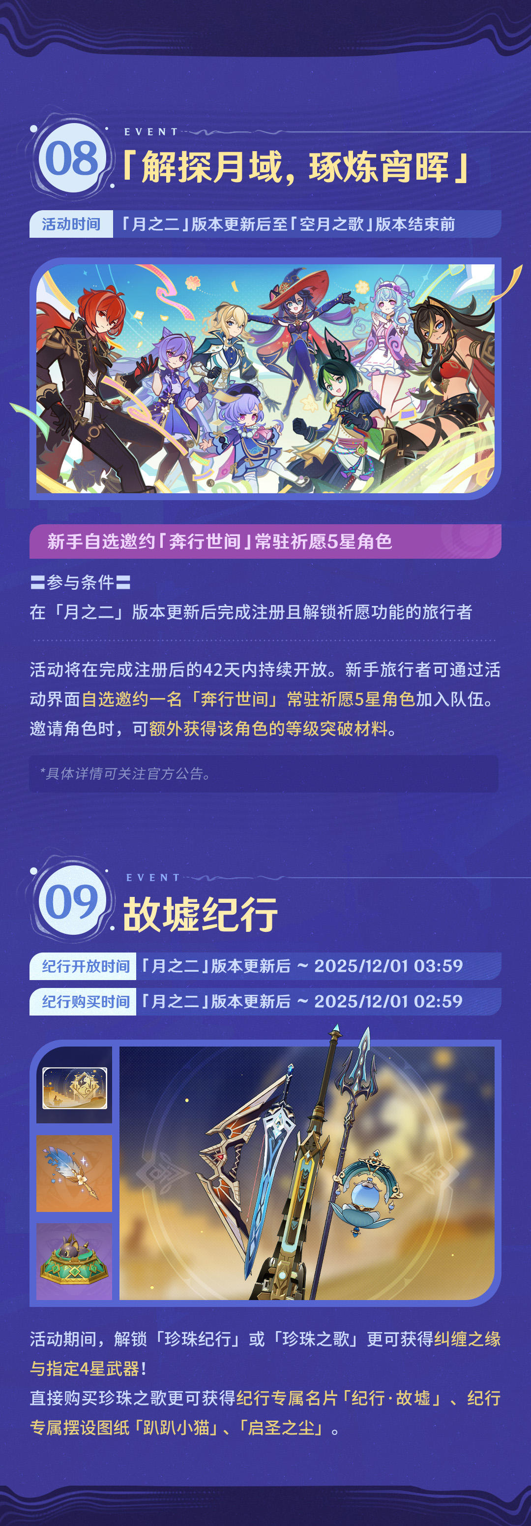 旅行者好呀~「月之二」版本「回望湮灭的月光」即将开启,一起来看看新版本中有哪些福利和活动吧!