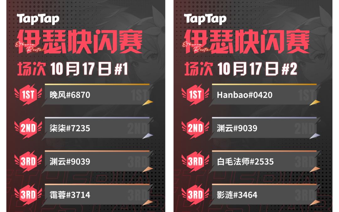 TapTap社区伊瑟快闪赛第二个比赛日完赛,恭喜下列选手取得好成绩!