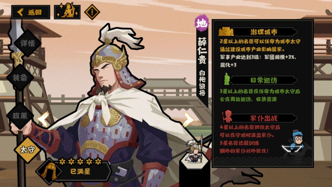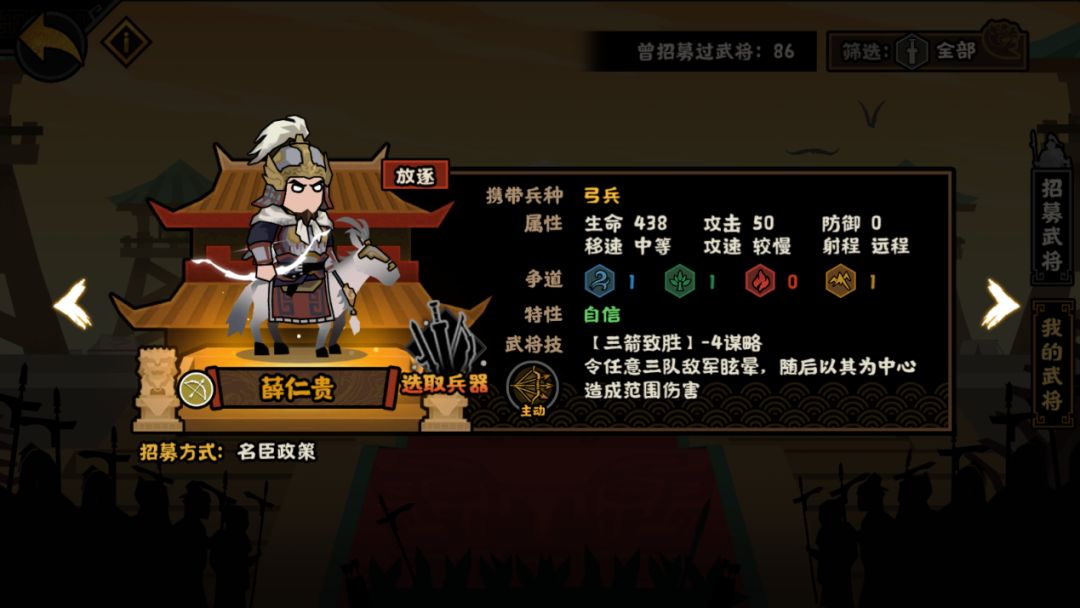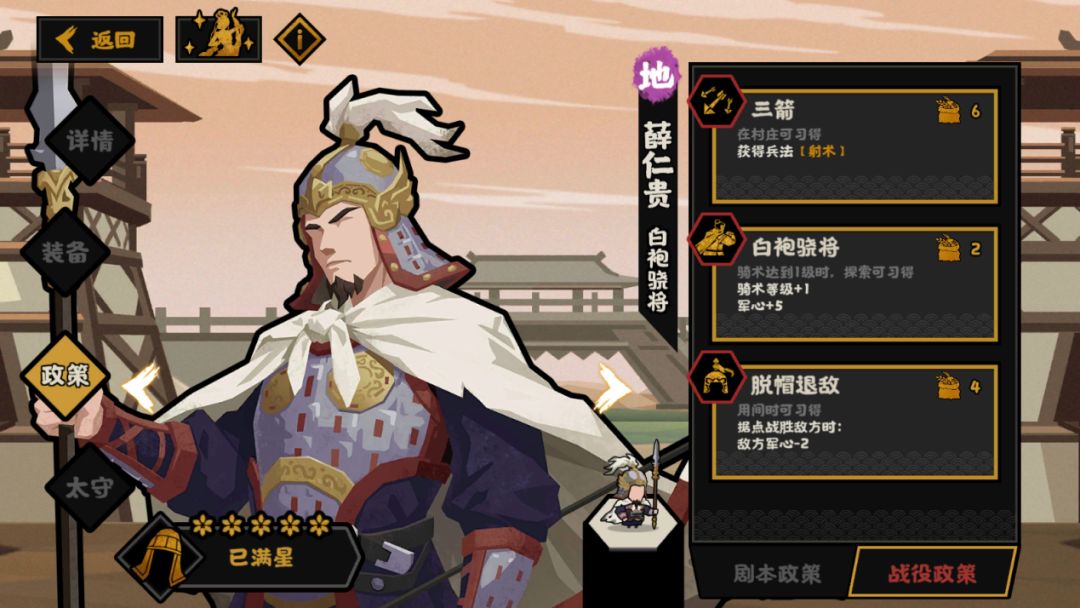 政策的缺点在于:扣除效果需要战斗胜利后回到大地图界面后才生效,因此对于第一场累战不太友好。同时对于弓兵来说,敌军军心太低容易导致伤害丢失,也不利于薛仁贵自身武将技的使用。