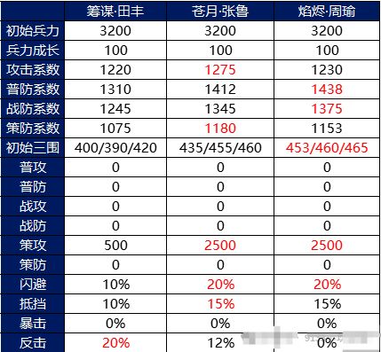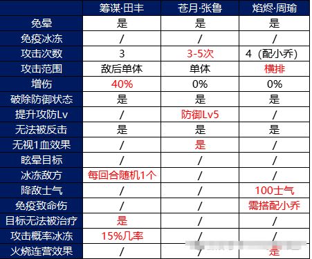 【筹谋·田丰】:攻击次数固定3次,打敌后单体,是这三个武将中唯一一个带有增伤的,还有一个特点是每回合会随机冰冻一个敌方武将,在攻击目标后会使目标无法被治疗和反击。
