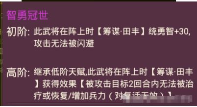 【豪勇·文丑】需要进阶两次,由【夫勇·文丑】开始进阶,该武将是跨消15W档次的武将,上阵豪勇·文丑可以让筹谋·田丰的三围+30,且让田丰在攻击敌方时让目标2回合内无法被治疗。