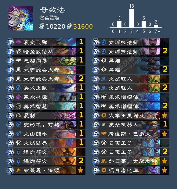 对局方面:这套对阵海军贼和巨化德小劣,对阵偶数萨大优,奥秘法小优。对阵快攻我们采取前期解场,中期返场的思路。起手留能够配合技能的低费随从,火焰结界和火山药水。黑猫配合aoe也能打出一波很可观的解场。另外衰变飞弹可以化解巨化德和偶数萨的场面压力。对阵慢速方面,这套对阵宇宙卡组均势,奇数战大优。对阵慢速卡组我们前期发挥技能优势配合奥秘体系持续输出,后期可以用铜须配合女巴罗夫,龙鹰之神等随从制造巨大的场面压力。我们还可以通过铜须+云雾王子或利用技能在后期打出直伤爆发。起手留奥术增幅体和火焰狂人等配合技能的三费随从,一般不留除爆炸外的奥秘和使奥秘减费的随从。复制可以回手吞火,龙鹰之神,火车王,云雾王子甚至是野猪,因此相比于奥秘法这套卡组拥有更强的续航能力。