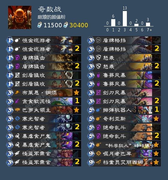 对局上打德默认快攻德,留鲁莽风暴和恒金巡游者,可留剑刃风暴。打萨满默认偶数萨,一般留鲁莽风暴和盾猛。 打贼留鲁莽风暴,食尸鬼,可留剑刃风暴。对阵慢速我们可以留铜须爆牌鱼来爆对面核心牌,或者铜须怪盗军需官找资源,以叠甲为主。这里不得不吹一手巴罗夫领主。这套牌配合巴罗夫的牌特别多,剑刃风暴,食尸鬼,掷弹机器人甚至dva的全场打1都可以清场。总之这套牌强度可观,适合快攻多的环境。