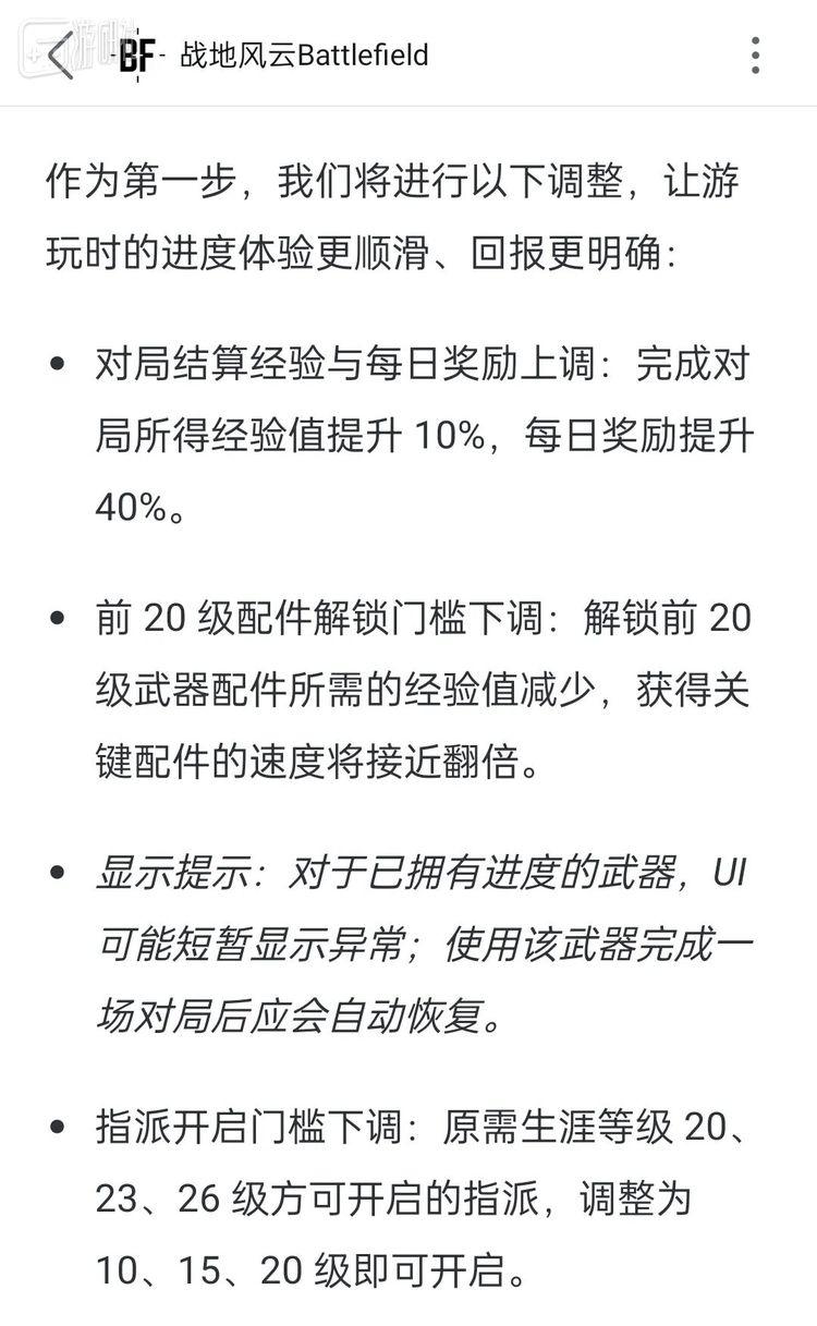 虽说这次《战地6》官方有意树立最基本的“听劝”人设,自内测阶段就经常根据社区反馈对游戏做出修复和调整。官方在我写这篇夜谈的时候实装了初步改进,上调帐户和枪械的经验值获取效率,并承诺会在将来优化任务的挑战条件。