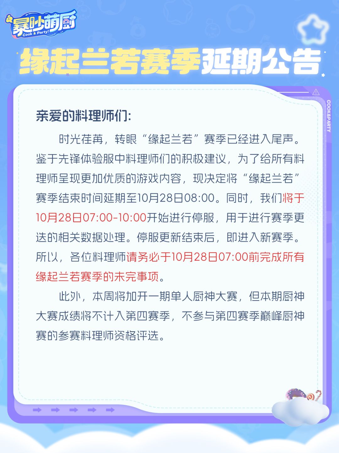 请各位料理师于10月28日07:00前完成缘起兰若赛季的未完事项。