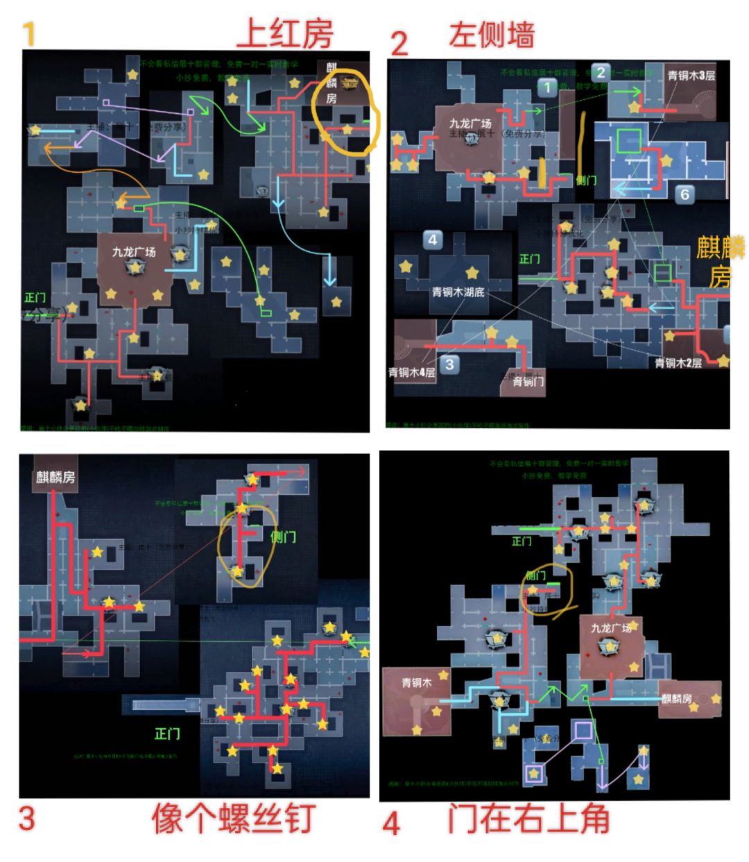 下面括号里面的只是用来辅助记忆的,只有一个锚点就可以了,坤仑秘境侧门 上,上下右黑左二路 的图...1,上面有个麒麟房(从你家附近经过麒麟房下3次楼梯之后来到了九龙广场来购物),2,左边有墙上下路(左边有个墙,绕过去来到了九龙广场,下了楼,用耳朵听见了,青铜门红旗🚩呼呼声,麒麟房天鹅在叫),青铜门就在4楼,麒麟房2楼,正门,3,鸭脖子图(螺丝钉图)(往上走麒麟房,往下正门),4,门在最右上角的位置(往下青铜木,右边下了楼之后就到了麒麟房,九龙广场)