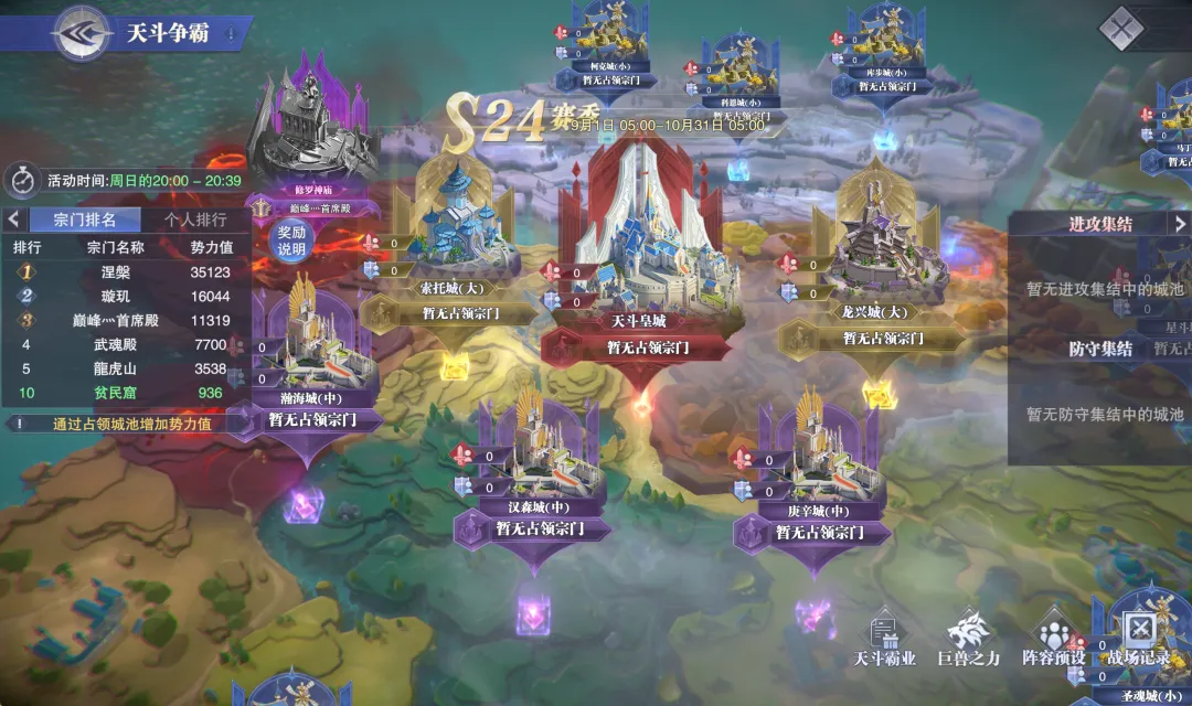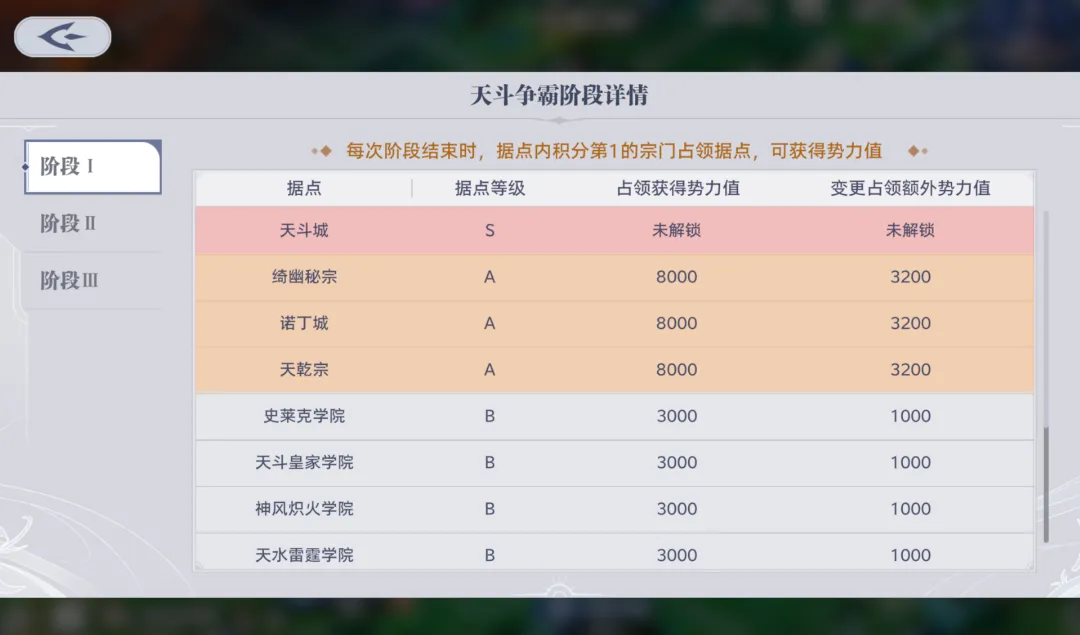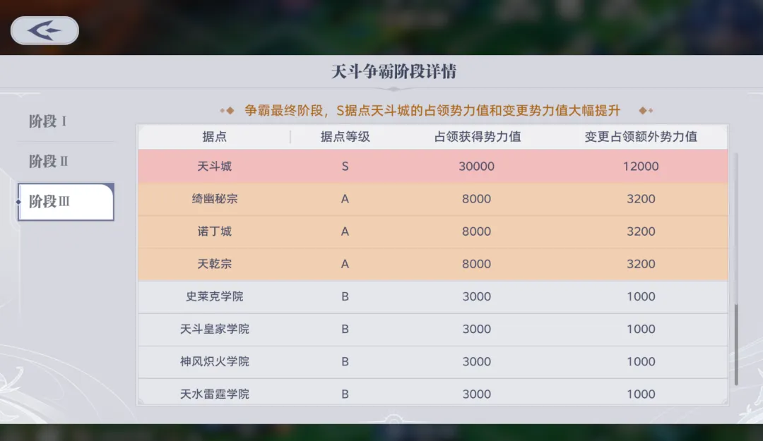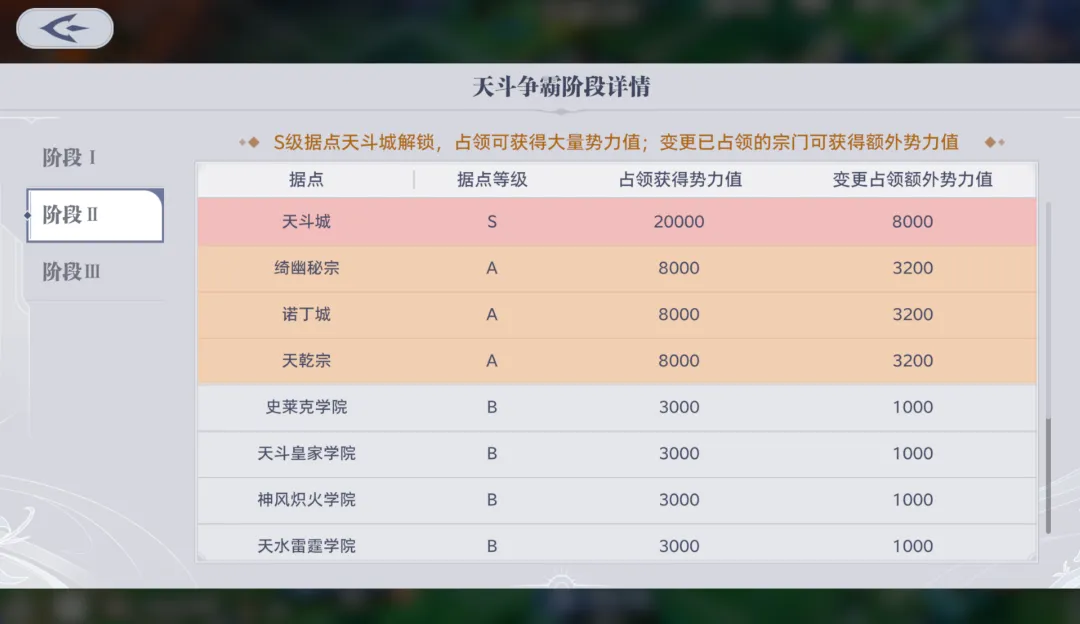- 三个阶段中的A级和B级城池,其占领积分与变更额外积分都是一样的,没有任何变化,但自天斗城解锁后,大家可以注意到第三阶段的天斗城占领积分与额外变更积分会比第二阶段多出50%,所以这个变化也是给不同宗门的指挥者带来了一定的博弈空间,例如第二阶段我占2个A级城池+2个b级城池就能超越1个S级城池的积分了,而第三阶段就不能这么来算了
