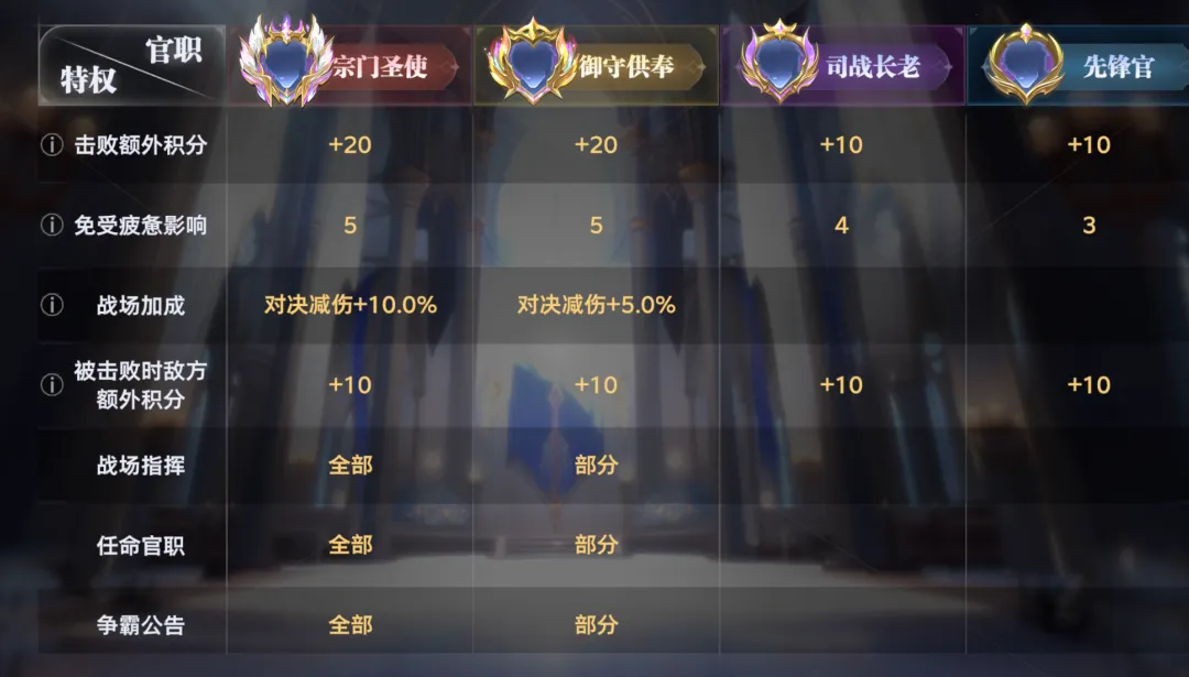 - 宗门首领需要对核心宗门成员的PVP技术有所了解,尽可能将高品阶的官职给到战力更高同时也兼具不俗PVP技术的玩家担任,这会对此玩法的进行起到非常重要的影响