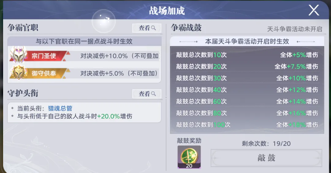 此外我们还能通过任免官职和擂鼓为队伍和宗门带来部分增益,一般来讲大点的宗门这个总计最多120次的擂鼓应该都可以拿满,关键则是不同官员的玩家到底能有多高的战力和技术支撑,他们到底又可以在不同的城池撑多久,当然理论上而言肯定是战力越高,技术越好的玩家越应该有官职,因为这个官职成员在击败敌人后会有额外的积分加成,此外还有免疫疲惫值的影响,所以给战力越高技术越好的玩家官职,一般都可以起到事半功倍的效果。