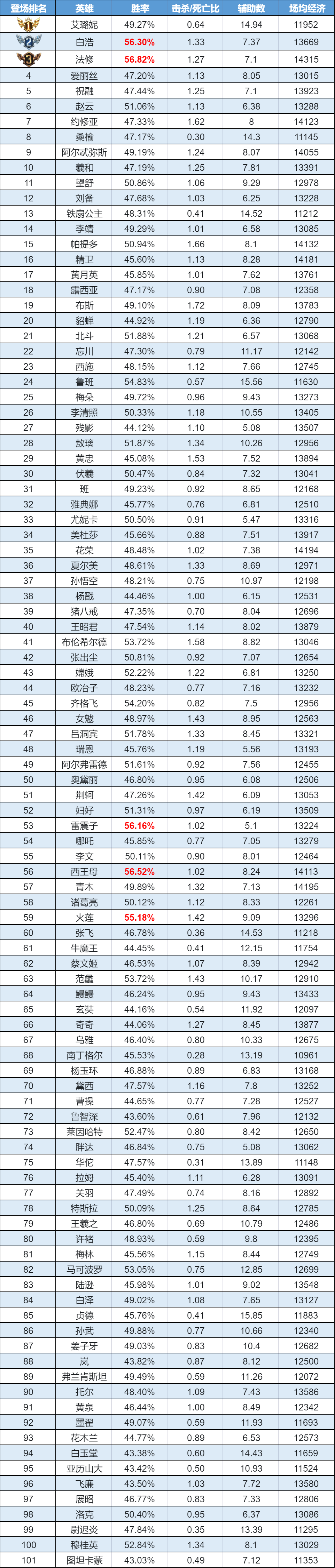 排序:按登场率高低排序,标红为胜率前5