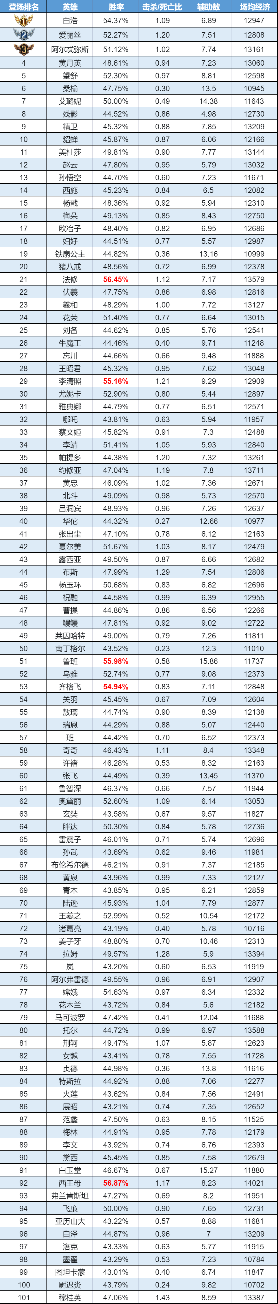 【低段位】白浩热度高涨,登顶人气榜;西王母双冠加冕,制霸胜率与经济双榜;托尔表现亮眼,跻身经济榜前五。