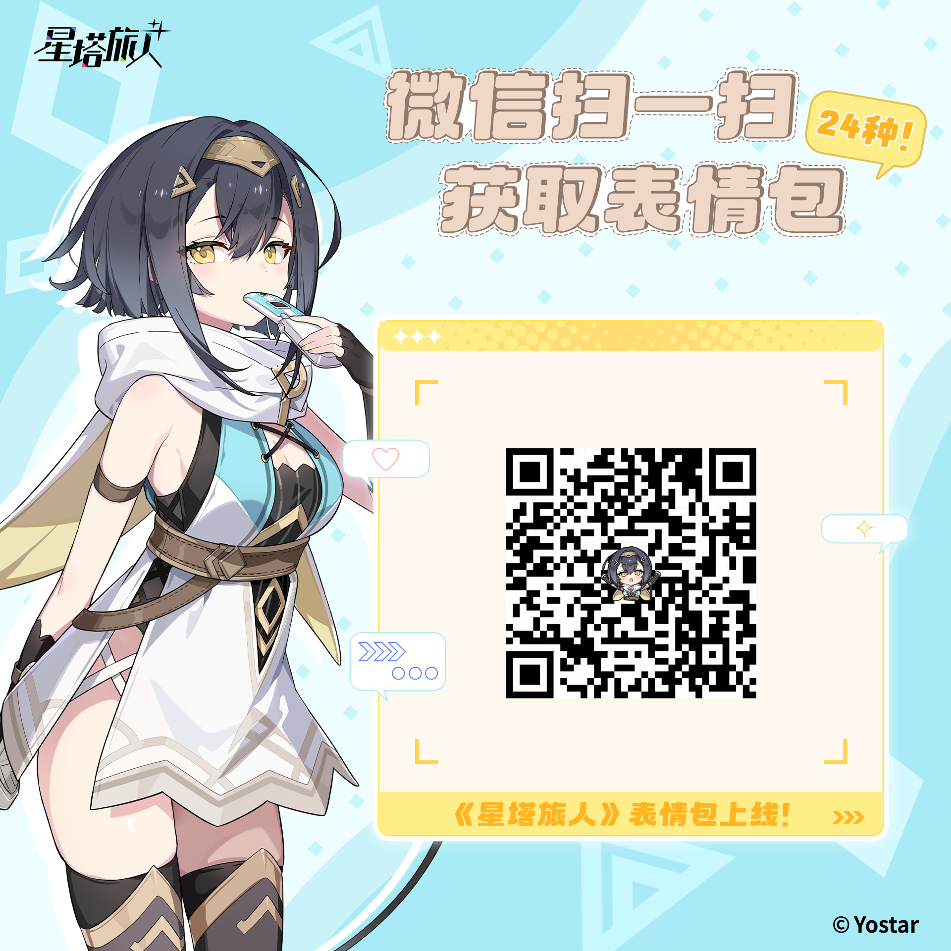 微信:使用微信扫描下图二维码即可跳转至对应表情商店;或点击微信界面底部导航栏「我」后,点击「表情」按钮,搜索关键词【星塔日常篇第0期】进行下载使用。