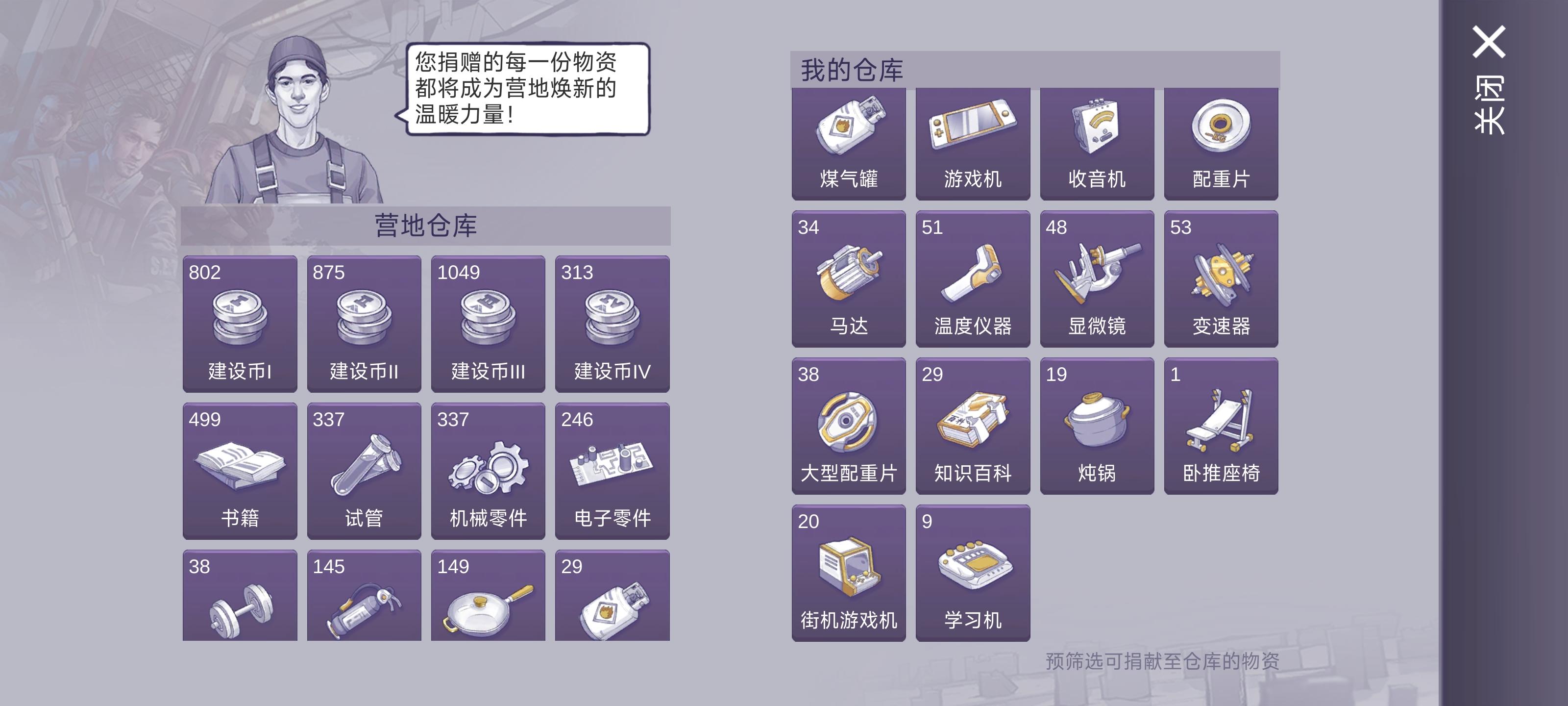 1.营地仓库进行捐献物资,可获得大量贡献券