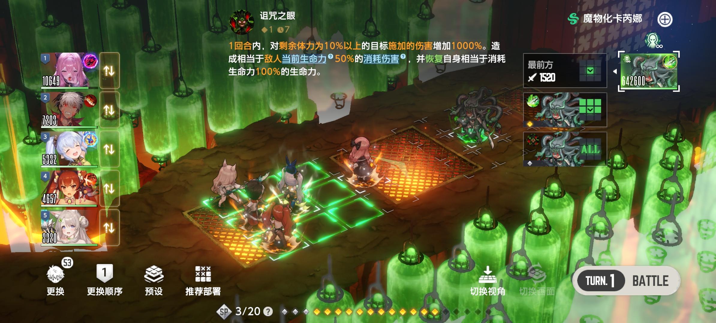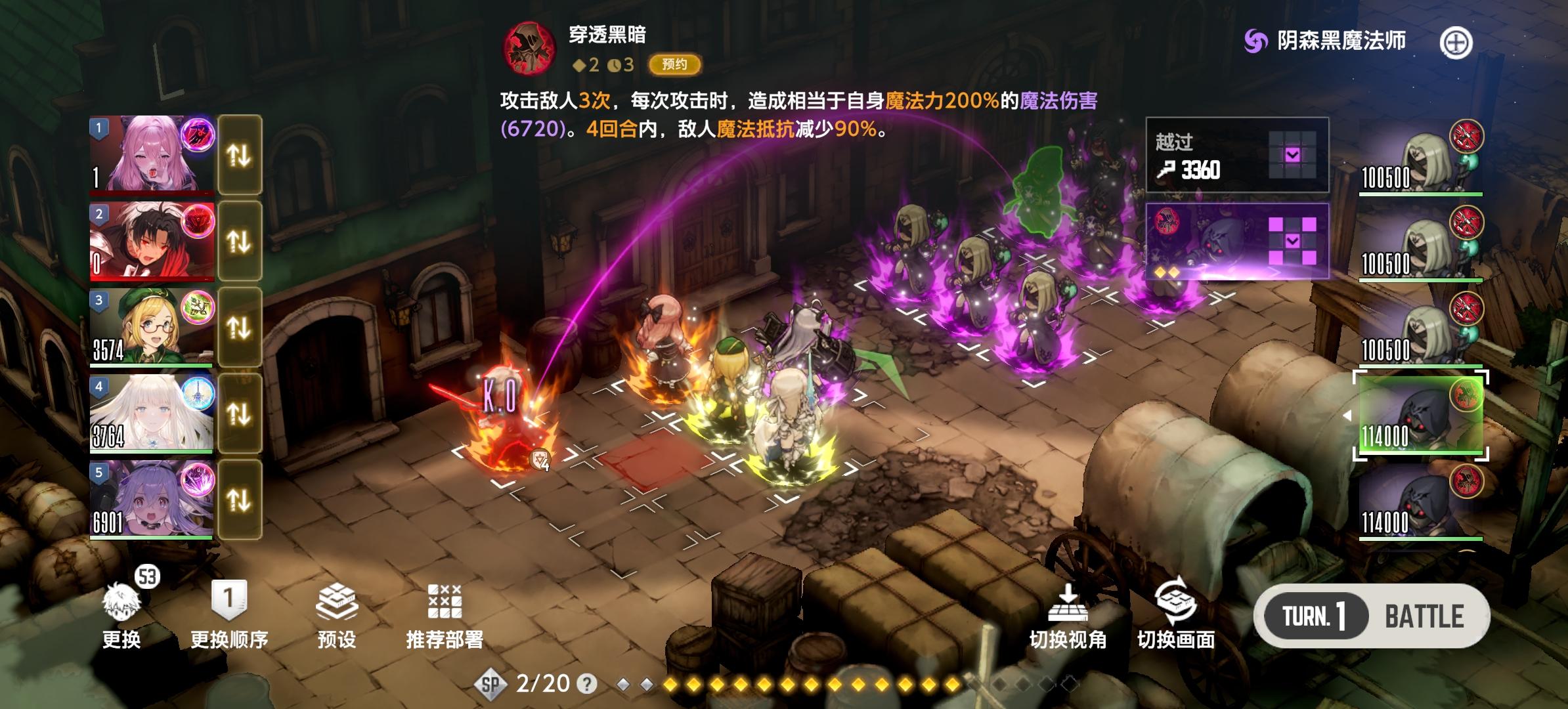 第一回合把威胁最大的+尽可能多清的杂兵,然后留意剩下杂兵攻击范围,调整角色摆放顺序(杂兵最好不要超过三个)。没打出爆伤就从新再打,如果出了爆伤伤害依旧不够就调整装备+属性。