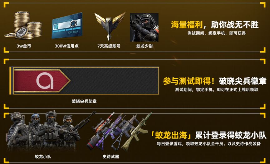 A:本次测试提供的游戏资产丰厚,可以使您充分体验游戏乐趣,部分限定勋章奖励还可以在公测继承!详情请查看官网【破晓行动测试】奖励介绍及公告。