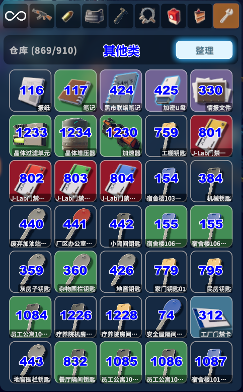 搞了一下午终于弄完了,里面确实有不少任务道具,还有很多不会出现在游戏内的物品(废案或未来可期?),但从头来太麻烦了,抱歉。我做这个主要是有东西实在摸不到,去网上翻还没有,想开修改器还要币子,一气之下从1推到1300多自己一个一个找,一直推到了1350多发现实在没有物品代码了才停。后面版本更新出新东西会再补充,这里面如果有缺漏也请大家帮忙补充,谢谢。