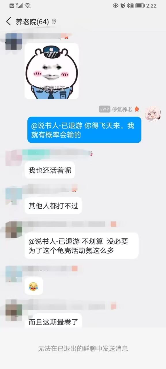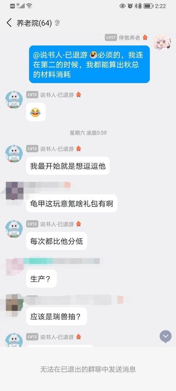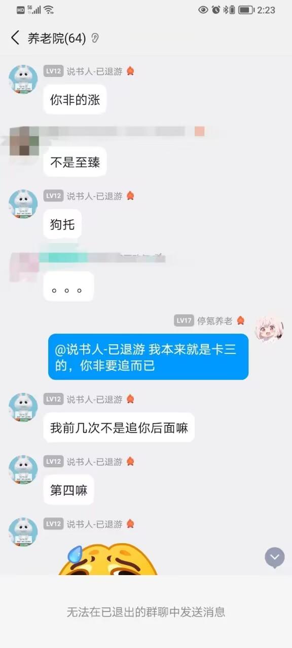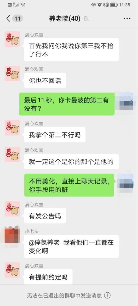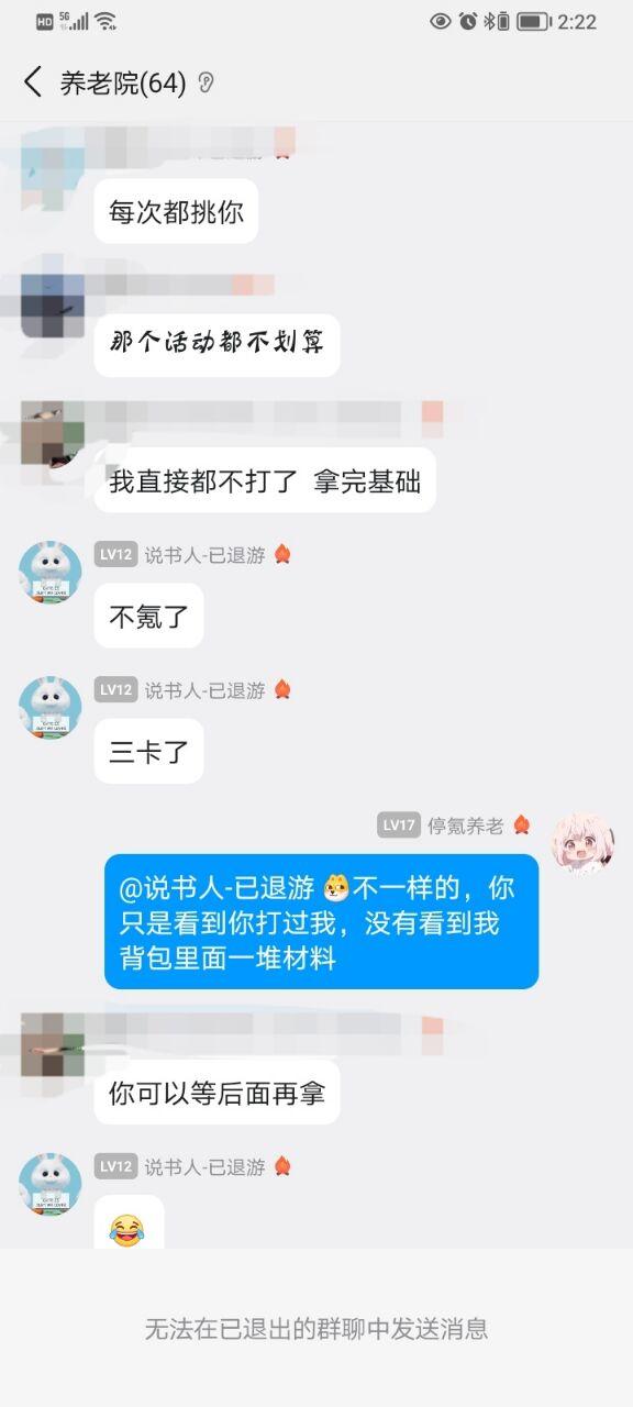 从这里开始,他就一直嚷嚷着要退游,但是我已经五次说明,我会让给他了,我不会跟他争。这个时候,这个人还很谦让的,大家都在一起嘻嘻哈哈。