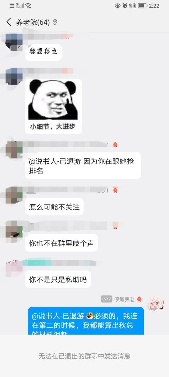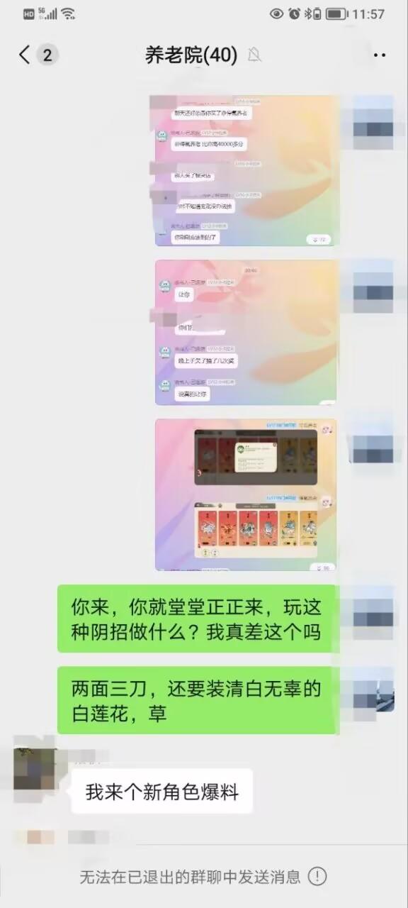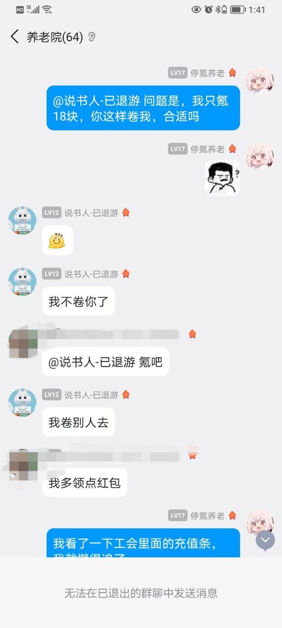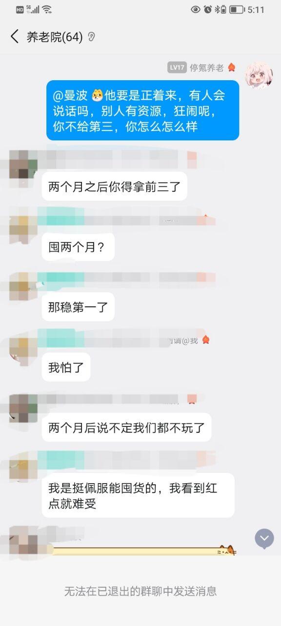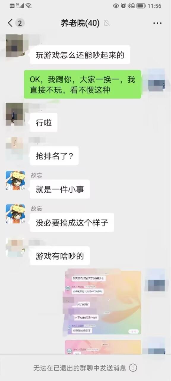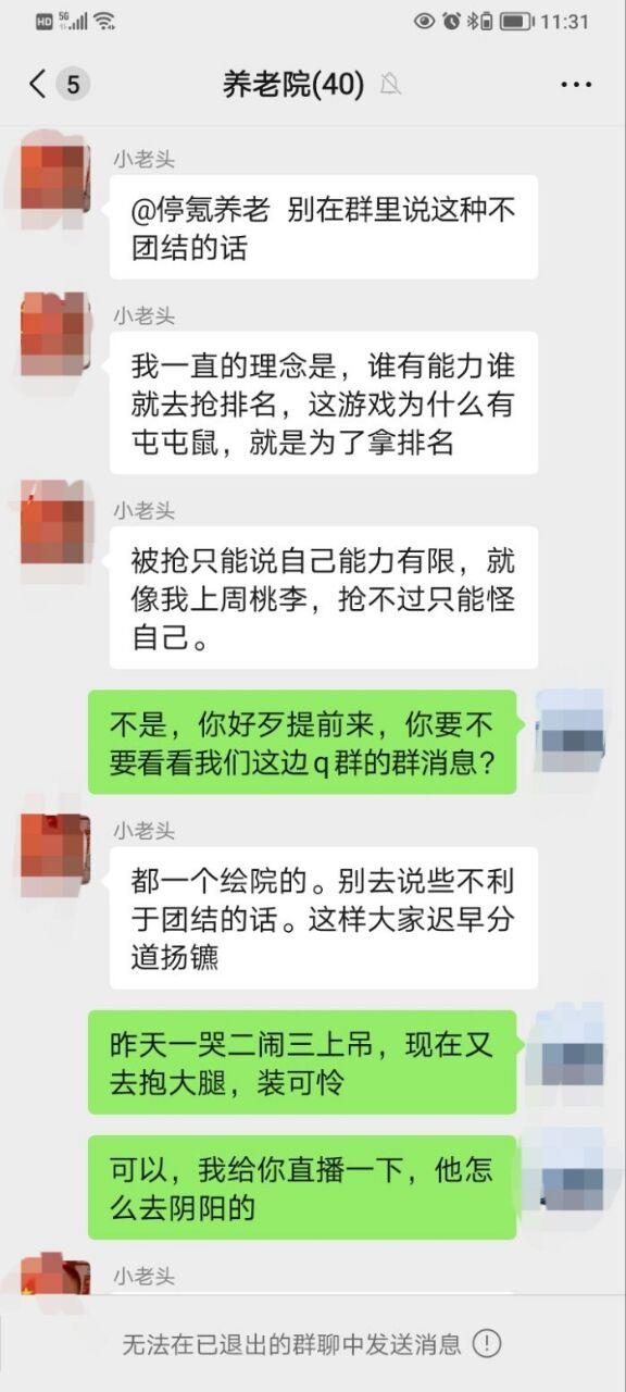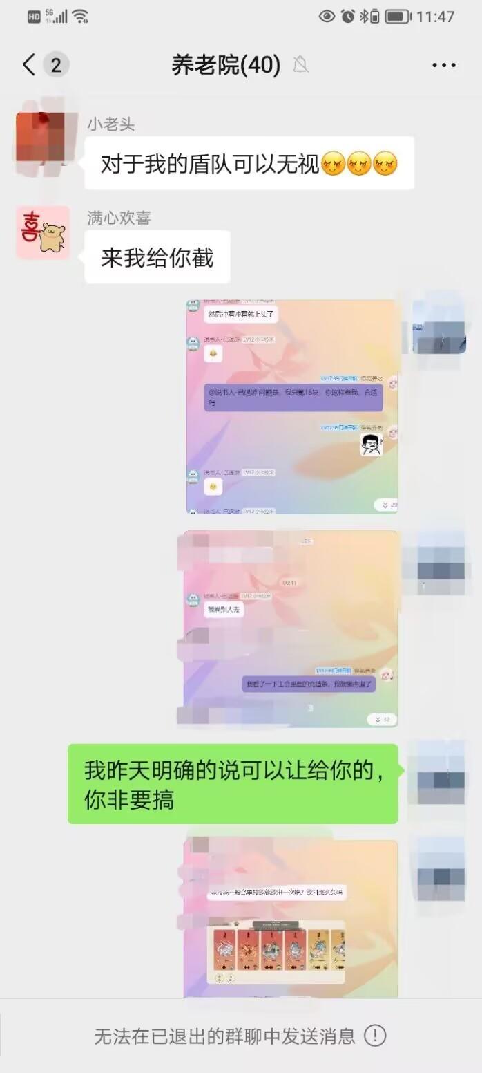 我已经五次说了要让给他了,他一直在公会群里面发他要弃坑了,他弃游了,他删除游戏了,见他这样说,我便把资源用上去了,不是我存心,有意去竞争,因为他之前的表现就是一个很好说话的人,大家都是彼此谦让的,但是让人没有想到的事情发生了,谁都看出这样谦让皮之下,就是两面三刀的底色。