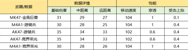 此外,我们将它与其他武器数据进行一下对比,MK47-金角巨兽与MA41-游骑兵、M4A1-竞界荣光相比,数据伤害和受击上抬都是MK47略胜一筹。与AK47-游骑兵、AK47-竞界荣光相比,AK枪械的数据伤害明显较高,但是在移动速度,穿透以及受击方面不如金角巨兽。综合来看,MK47-金角巨兽的数据伤害接近于M4A1,性能方面优势突出的武器。在这个价位区间,性价比还是很高的。