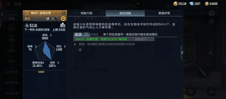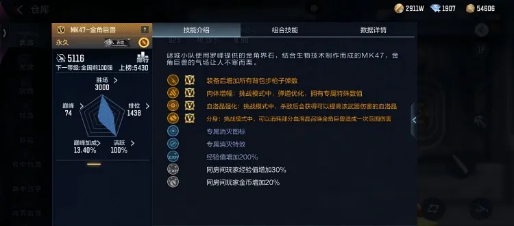 MK47-金角巨兽拥有常规英雄级步枪增加主弹匣子弹数、经验、金币加成属性,除此之外,在挑战模式中,拥有专属特殊数值,杀敌可获得血洛晶,消耗部分血洛晶可召唤金角巨兽造成一次范围伤害。
